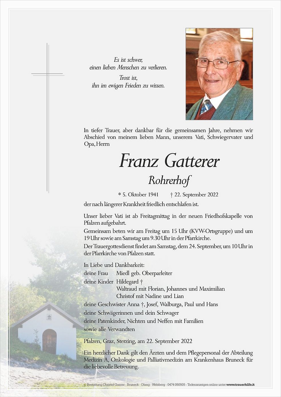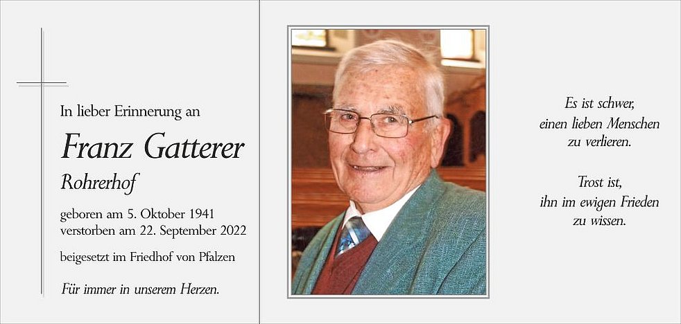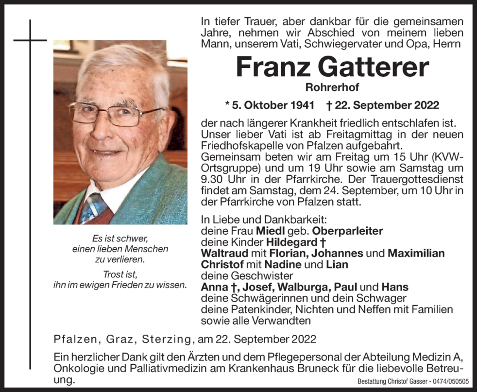 Der Trauergottesdienst findet am Samstag, dem 24. September, um 10 Uhr in der Pfarrkirche von Pfalzen statt.