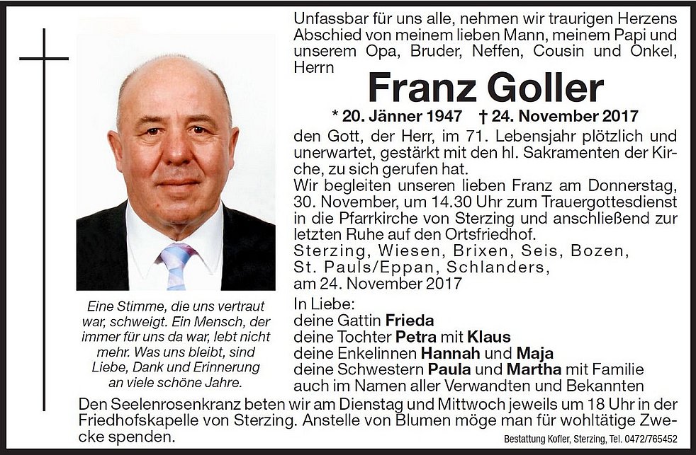 Wir begleiten unseren lieben Franz am Donnerstag, 30. November, um 14.30 Uhr zum Trauergottesdienst in die Pfarrkirche von Sterzing und anschließend zur letzten Ruhe auf den Ortsfriedhof.