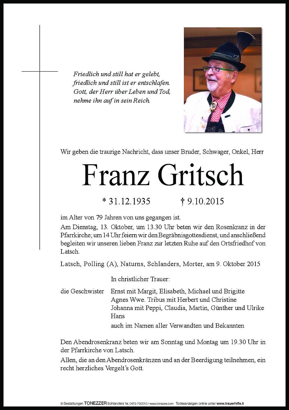Am Dienstag, 13. Oktober, um 13.30 Uhr beten wir den Rosenkranz in der Pfarrkirche; um 14 Uhr feiern wir den Begräbnisgottesdienst, und anschließend begleiten wir unseren lieben Franz zur letzten Ruhe auf den Ortsfriedhof von Latsch.