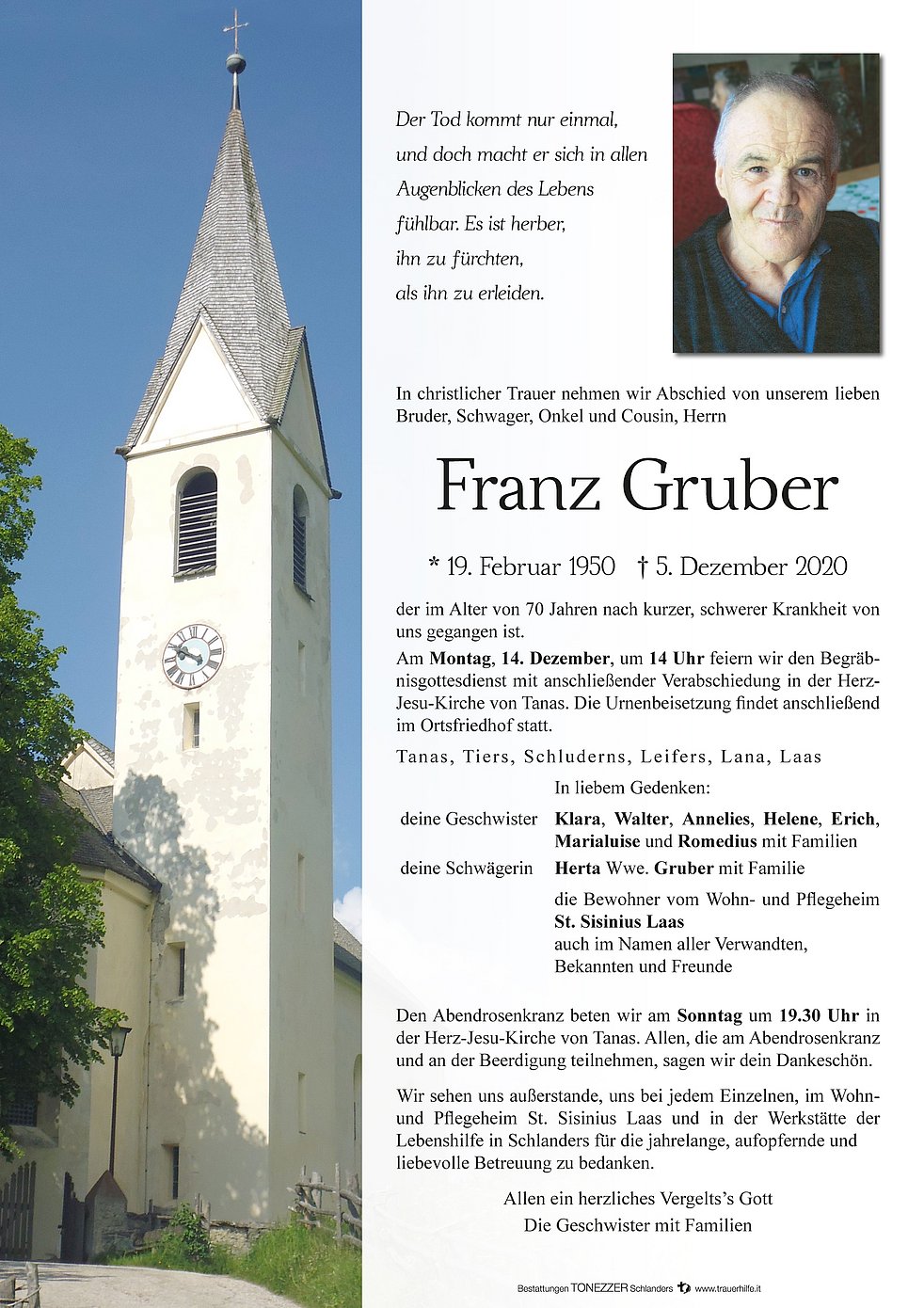 Am Montag, 14. Dezember, um 14 Uhr feiern wir den Begräbnisgottesdienst mit anschließender Verabschiedung in der Herz-Jesu-Kirche von Tanas.