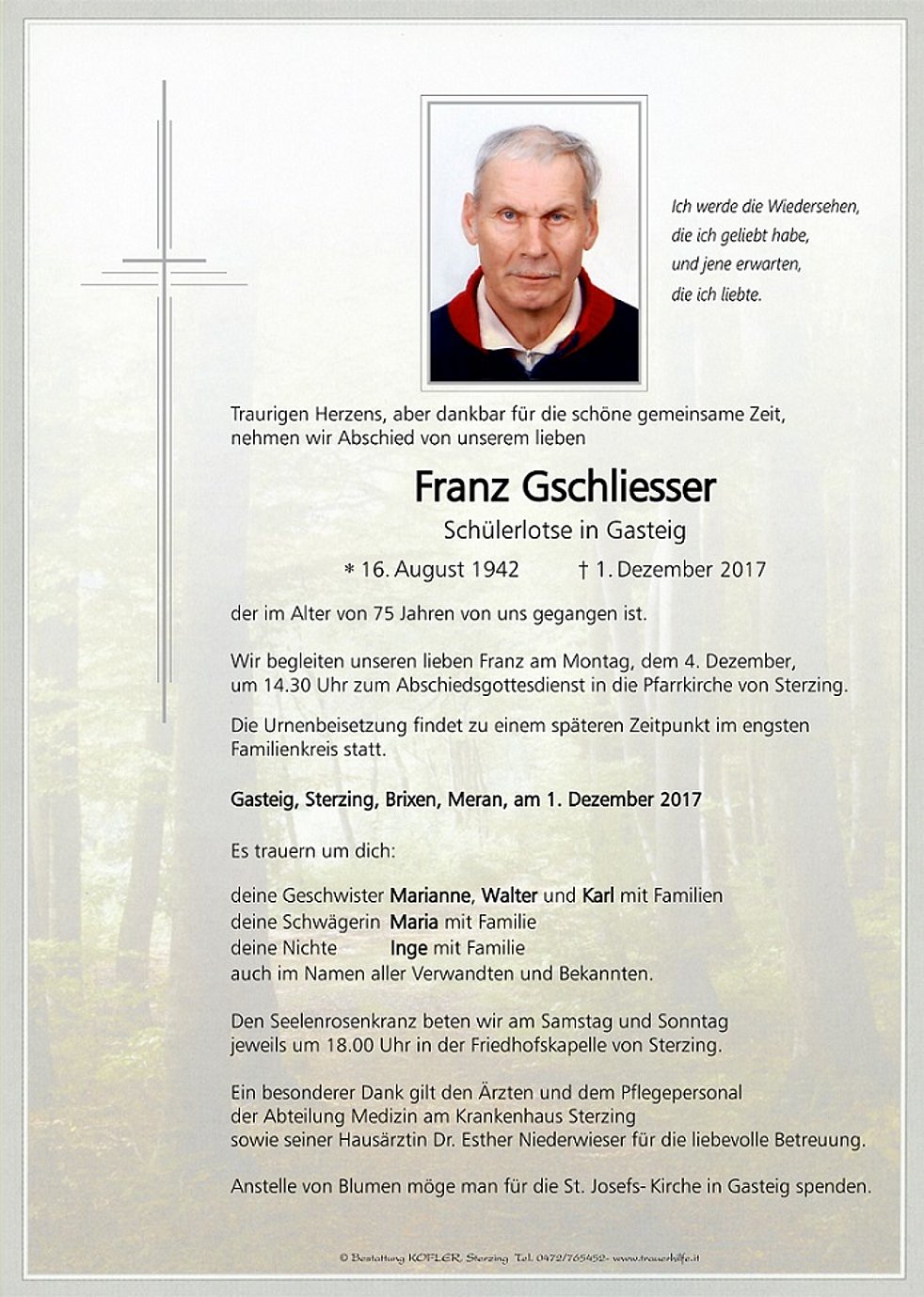 Wir begleiten unseren lieben Franz am Montag, 4. Dezember, um 14.30 Uhr zum Abschiedsgottesdienst in die Pfarrkirche von Sterzing.