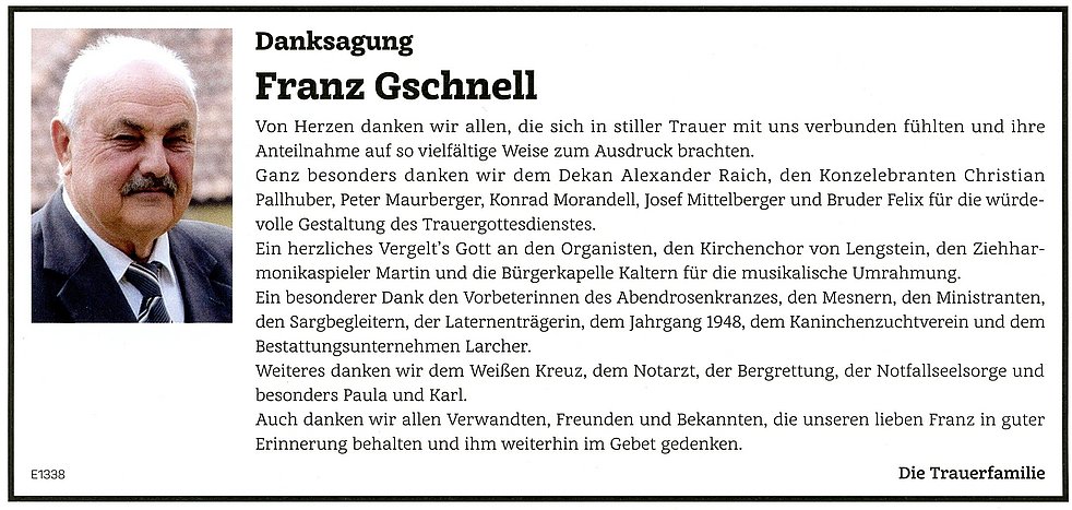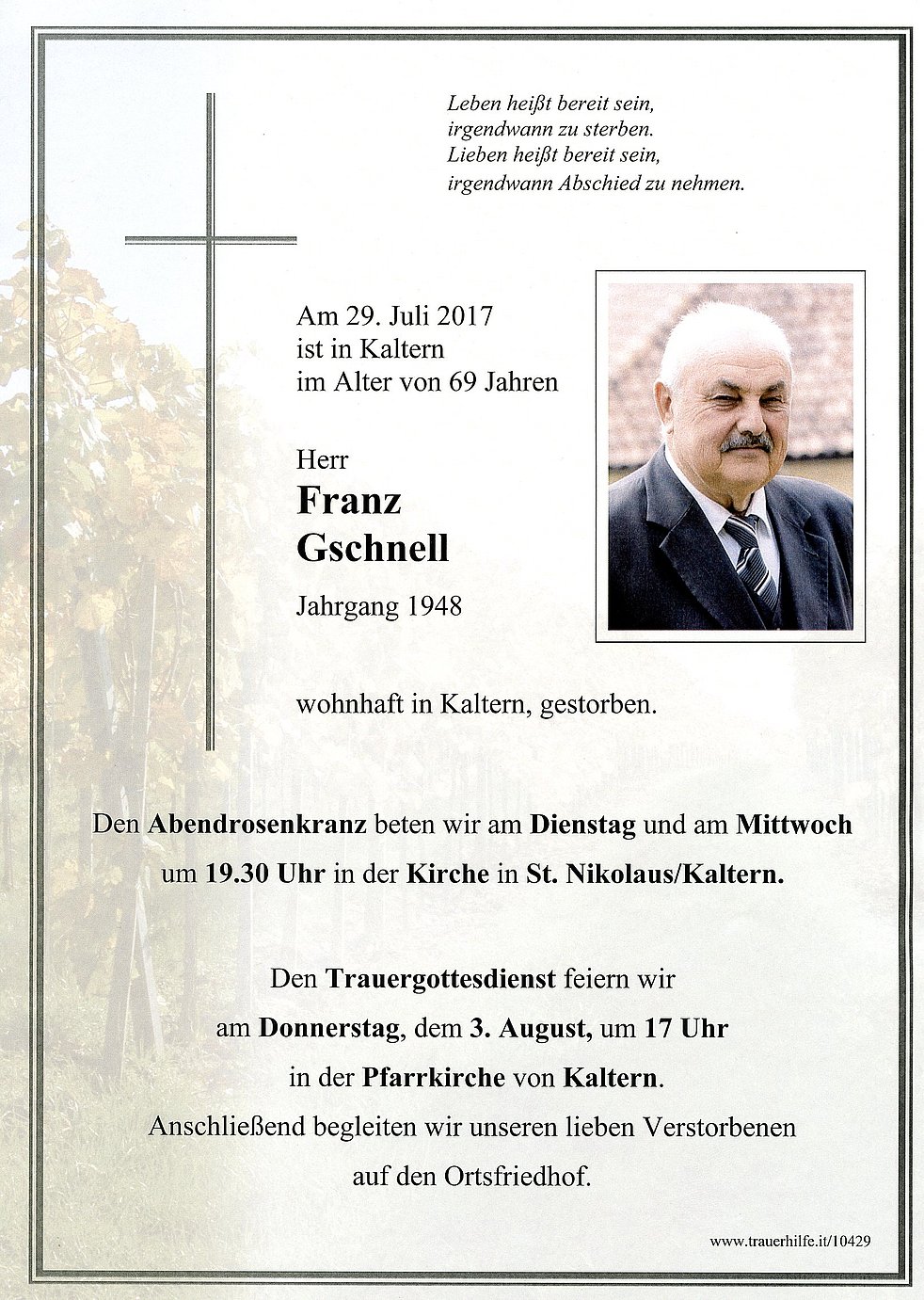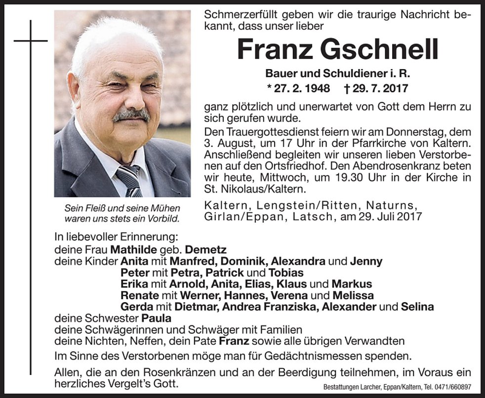 Den Trauergottesdienst feiern wir am Donnerstag, dem 3. August um 17 Uhr in der Pfarrkirche von Kaltern. Anschließend begleiten wir unseren lieben Verstorbenen auf den Ortsfriedhof.