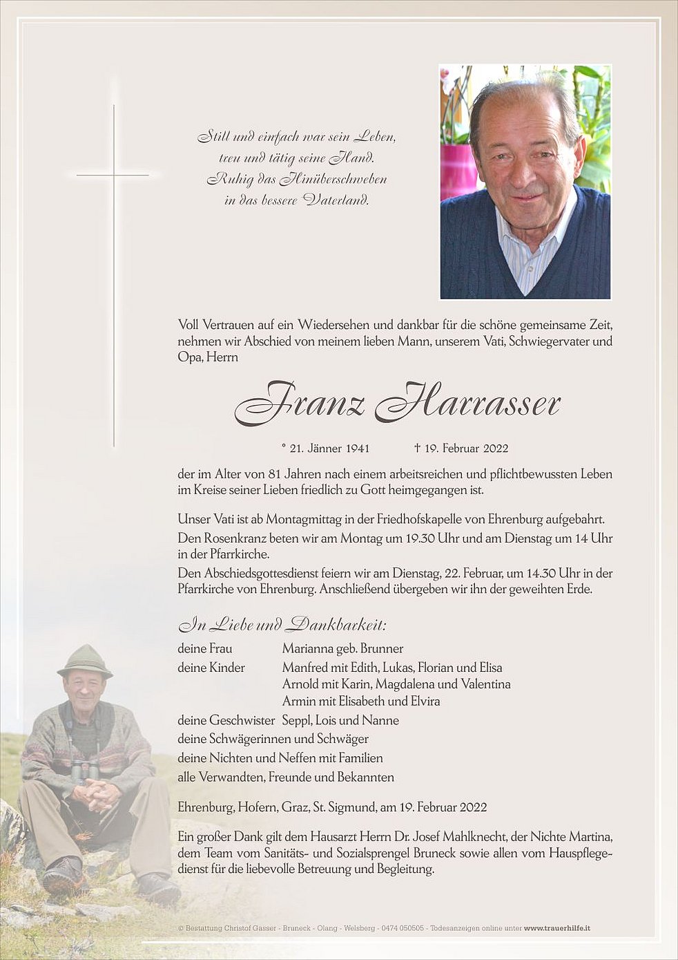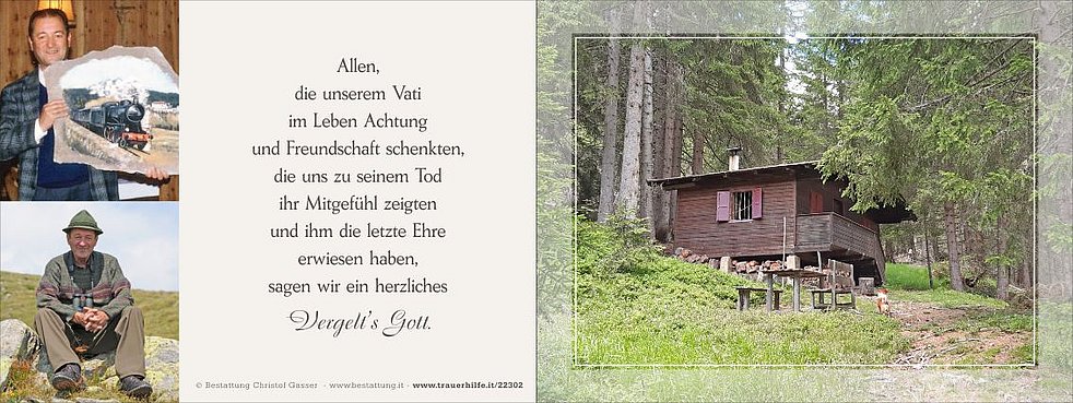 Ein großer Dank gilt dem Hausarzt Herrn Dr. Josef Mahlknecht, der Nichte Martina, dem Team vom Sanitäts- und Sozialsprengel Bruneck sowie allen vom Hauspflegedienst für die liebevolle Betreuung und Begleitung.