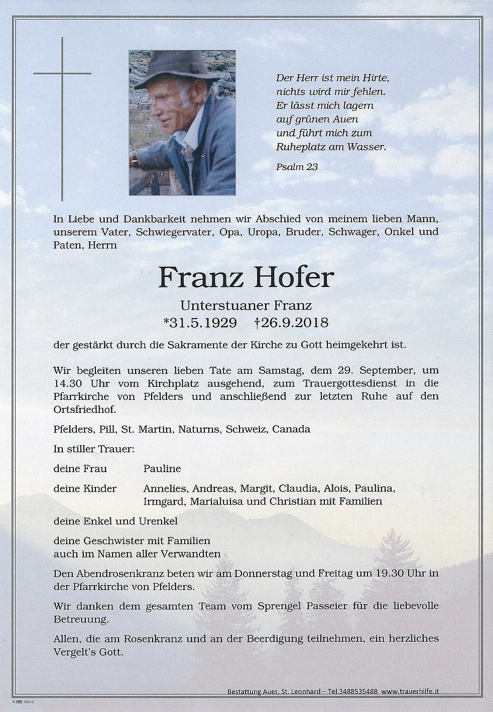 Wir begleiten unseren lieben Tate am Samstag, dem 29. September, um 14.30 Uhr vom Kirchplatz ausgehend, zum Trauergottesdienst in die Pfarrkirche von Pfelders und anschließend zur letzten Ruhe auf den Ortsfriedhof.
