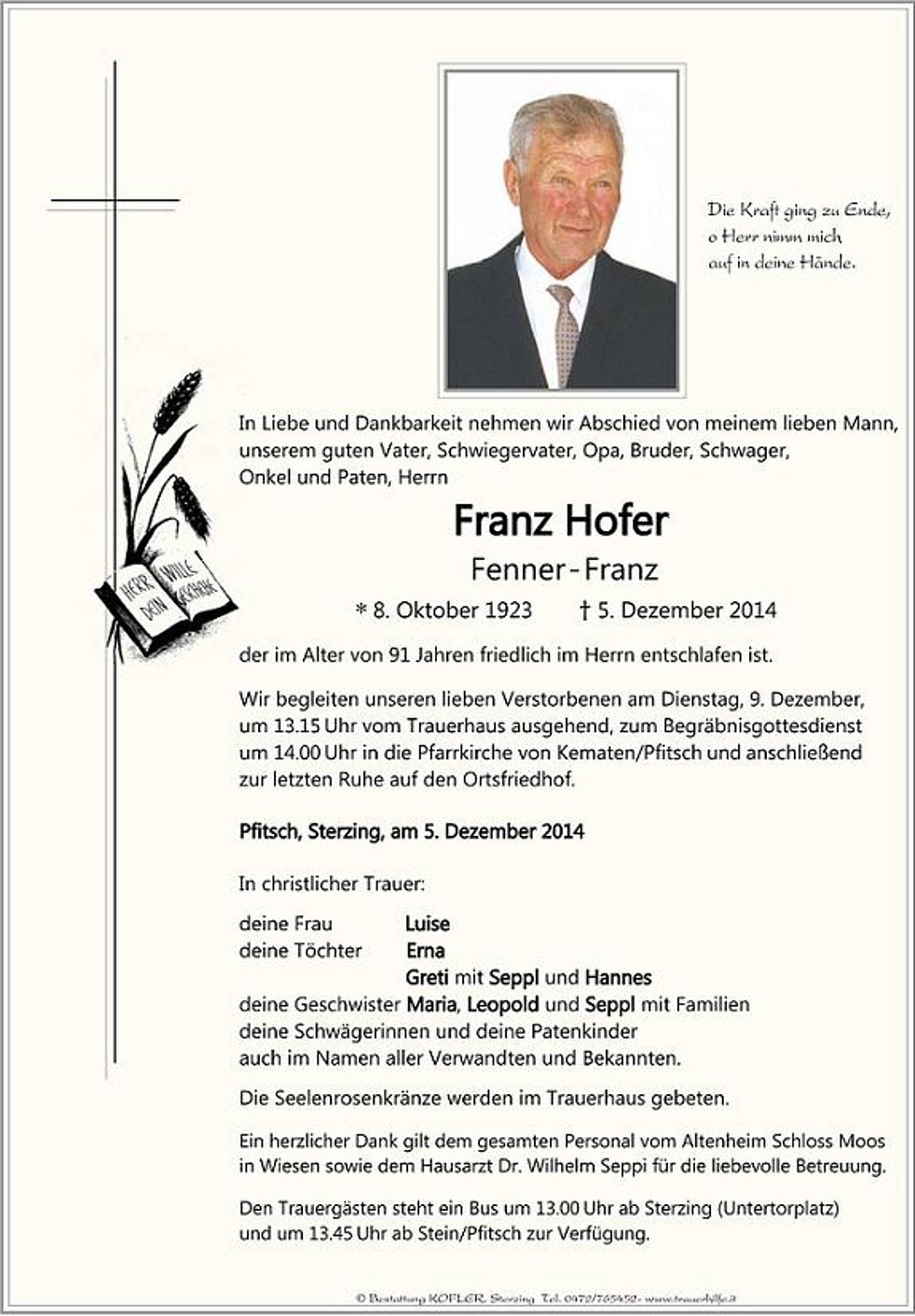 Den Trauergästen steht ein Bus um 13.00 Uhr ab Sterzing (Untertorplatz)