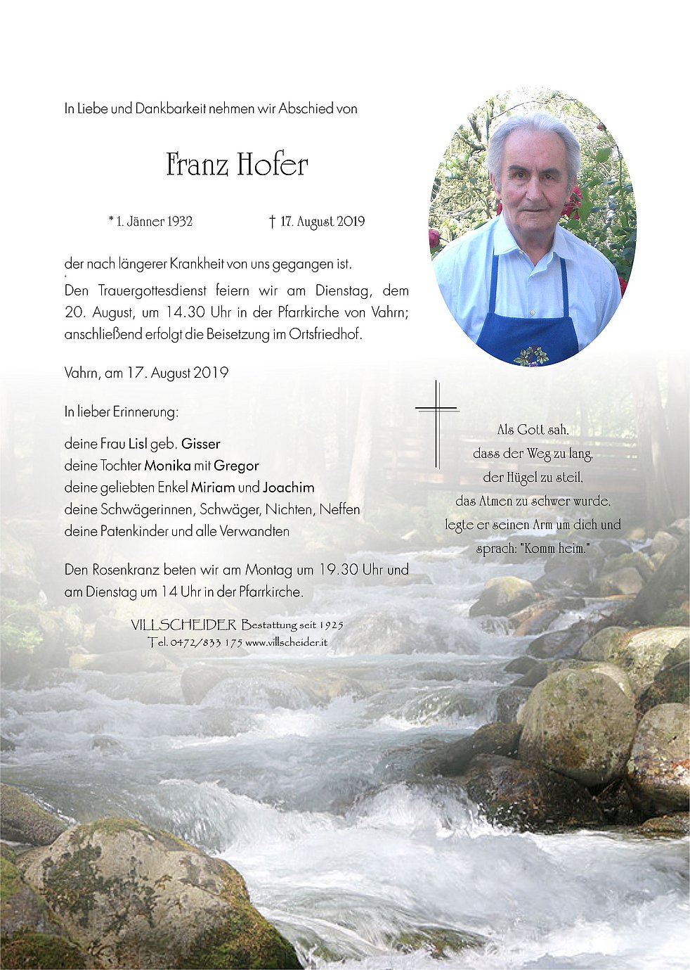 Begräbnisgottesdienst: 20.08. - 14:30 Uhr Vahrn