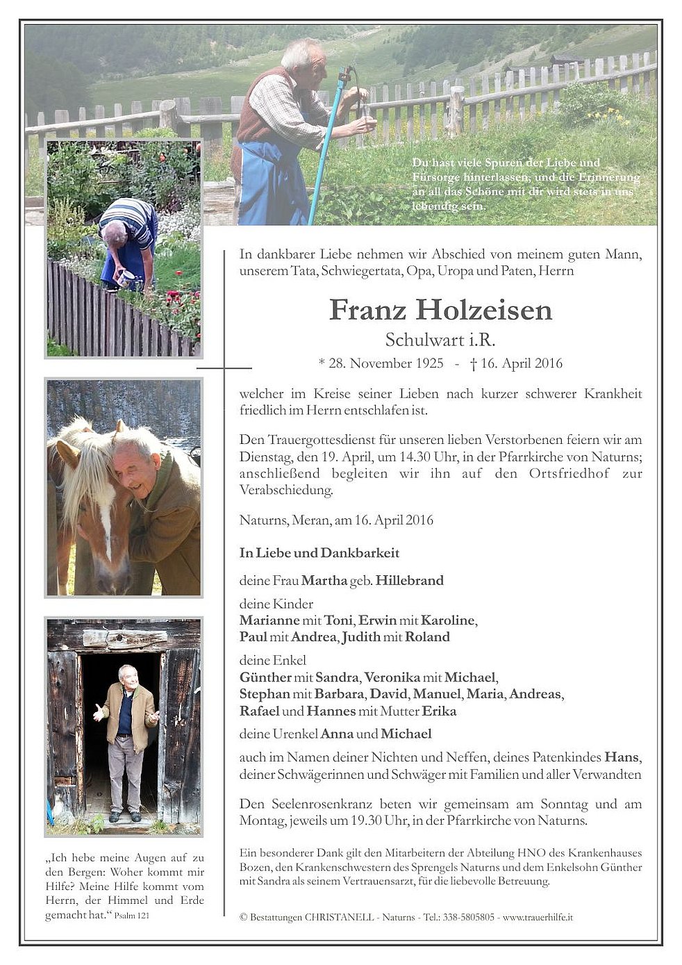 Den Trauergottesdienst für unseren lieben Verstorbenen feiern wir am Dienstag, den 19. April, um 14.30 Uhr, in der Pfarrkirche von Naturns; anschließend begleiten wir ihn auf den Ortsfriedhof zur Verabschiedung.