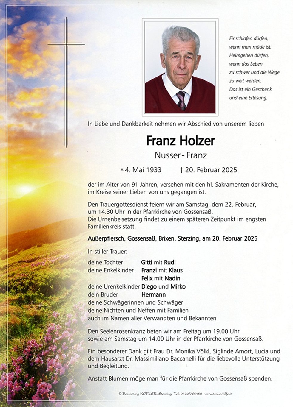 Anstatt Blumen möge man für die Pfarrkirche von Gossensaß spenden.