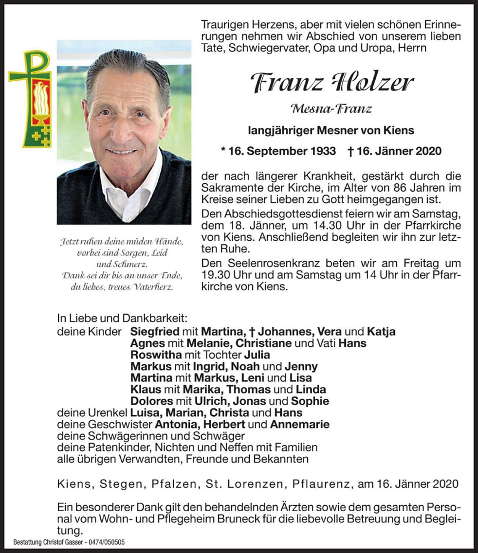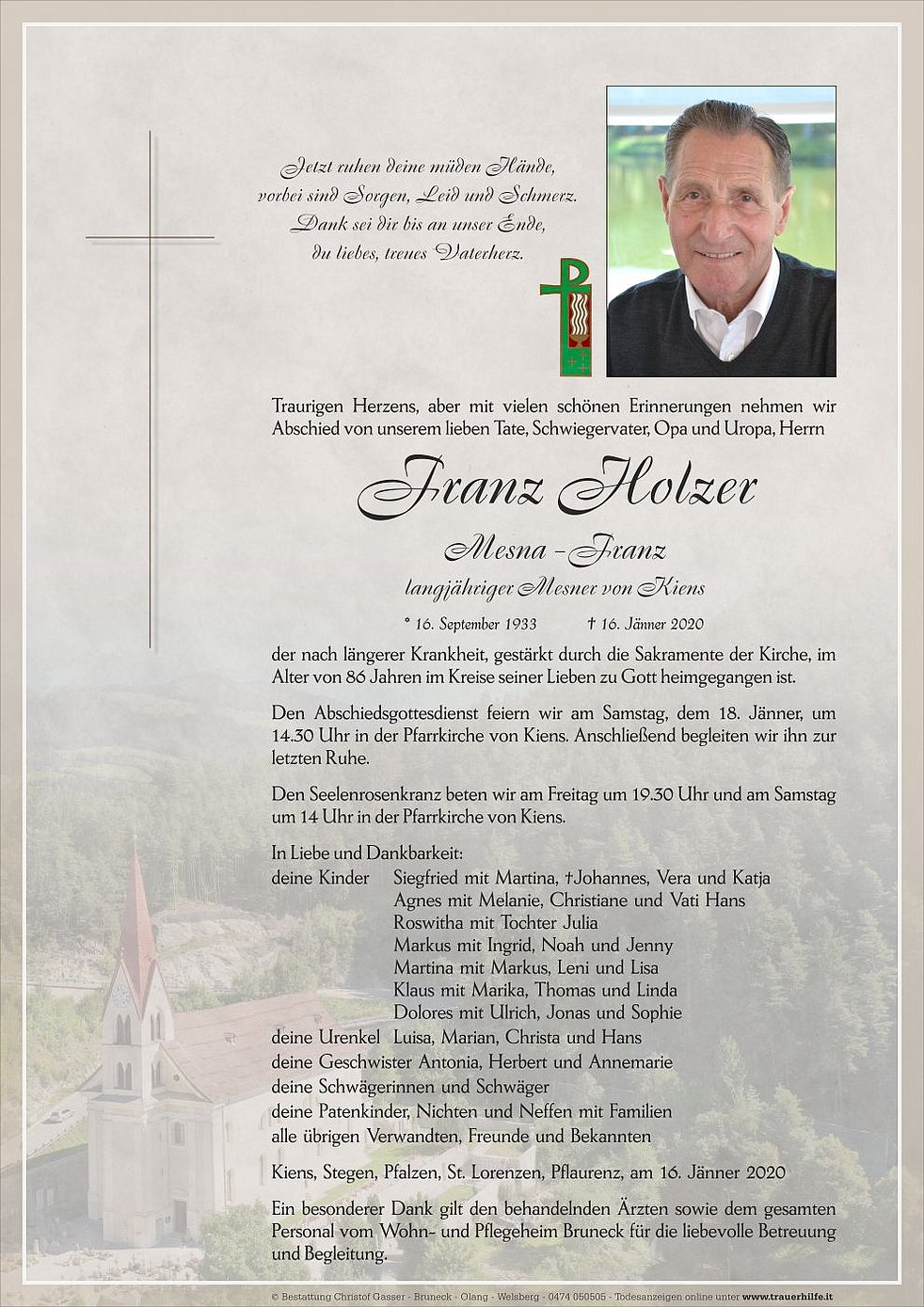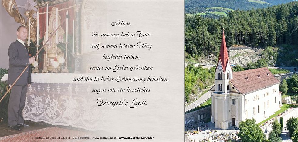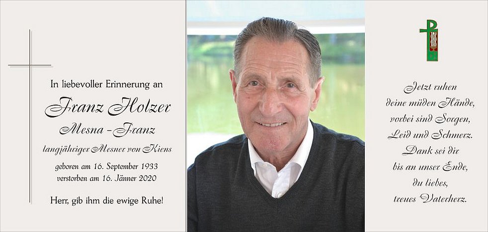 Den Abschiedsgottesdienst feiern wir am Samstag, dem 18. Jänner, um 14.30 Uhr in der Pfarrkirche von Kiens. Anschließend begleiten wir ihn zur letzten Ruhe.