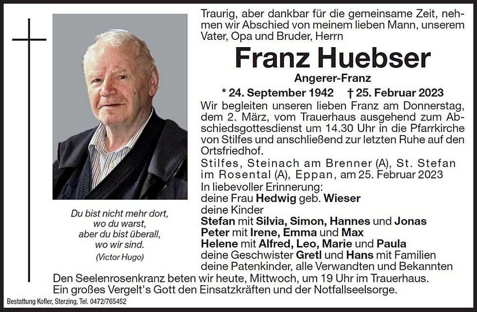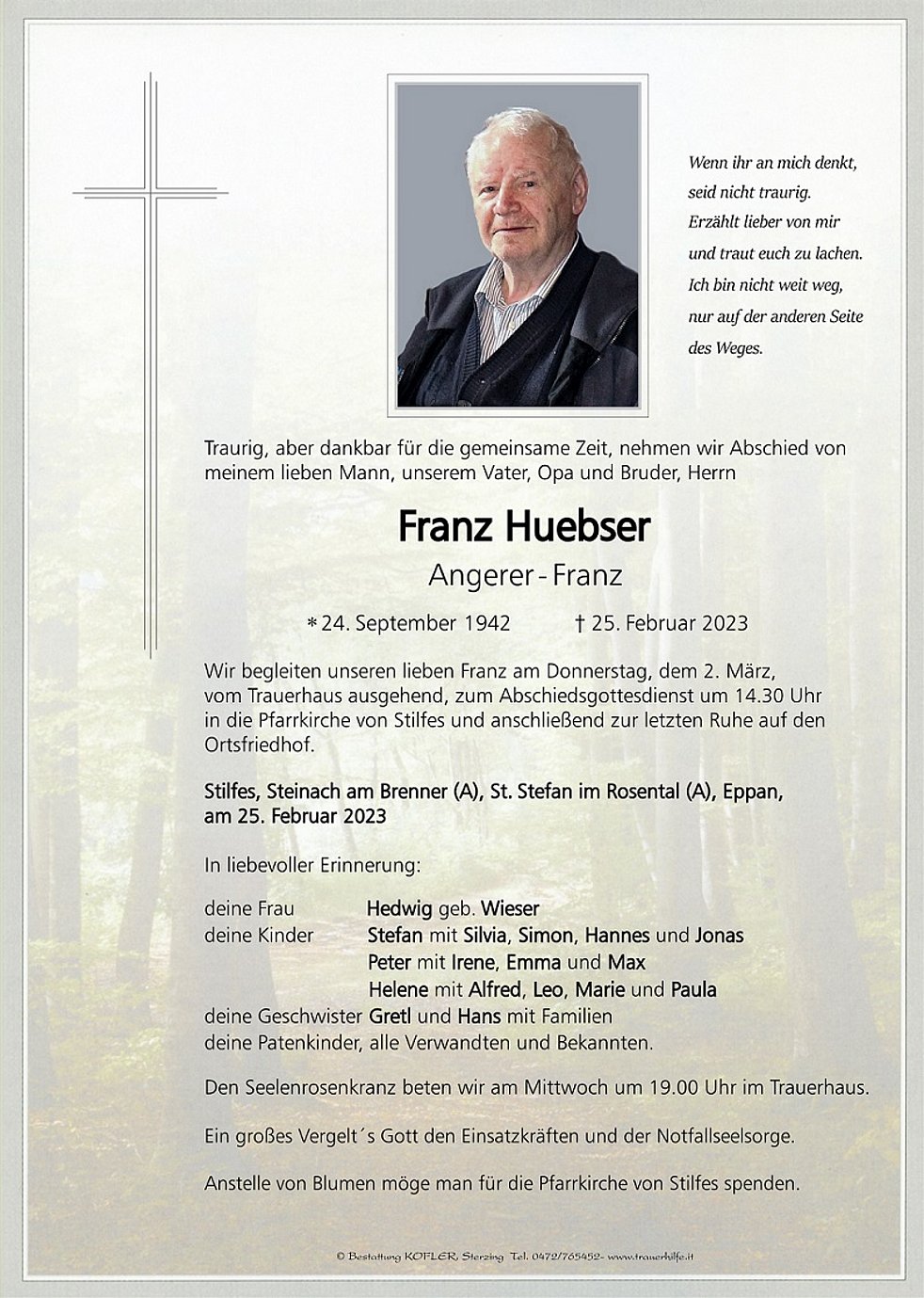 Wir begleiten unseren lieben Franz am Donnerstag, dem 2. März, vom Trauerhaus ausgehend, zum Abschiedsgottesdienst um 14.30 Uhr in die Pfarrkirche von Stilfes und anschließend zur letzten Ruhe auf den Ortsfriedhof.