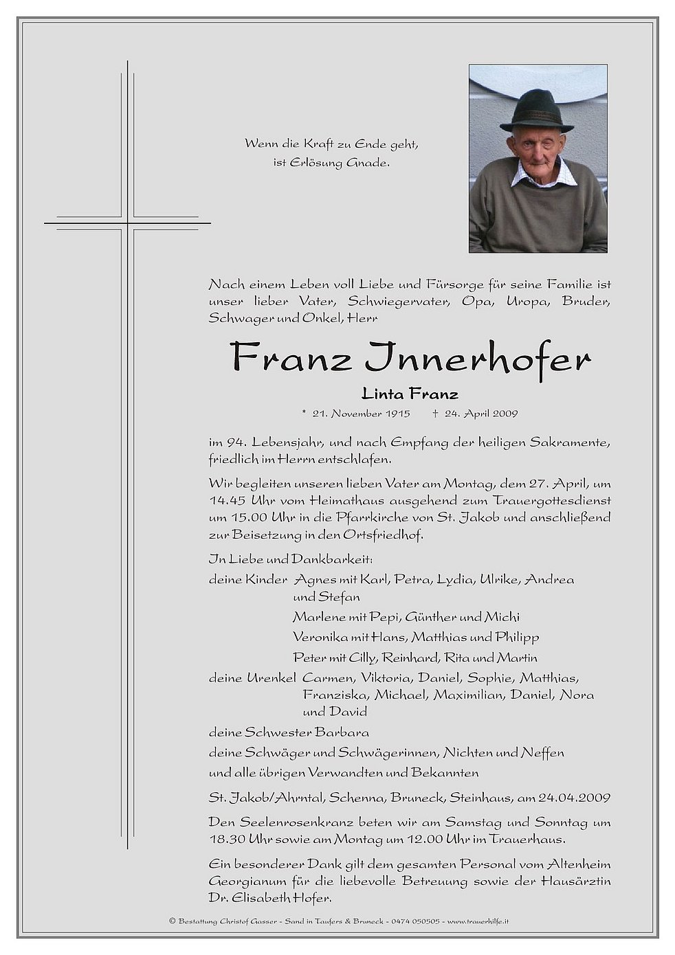 Wir begleiten unseren lieben Vater am Montag, dem 27. April, um 14.45 Uhr vom Heimathaus ausgehend zum Trauergottesdienst um 15.00 Uhr in die Pfarrkirche von St. Jakob und anschließend zur Beisetzung in den Ortsfriedhof.