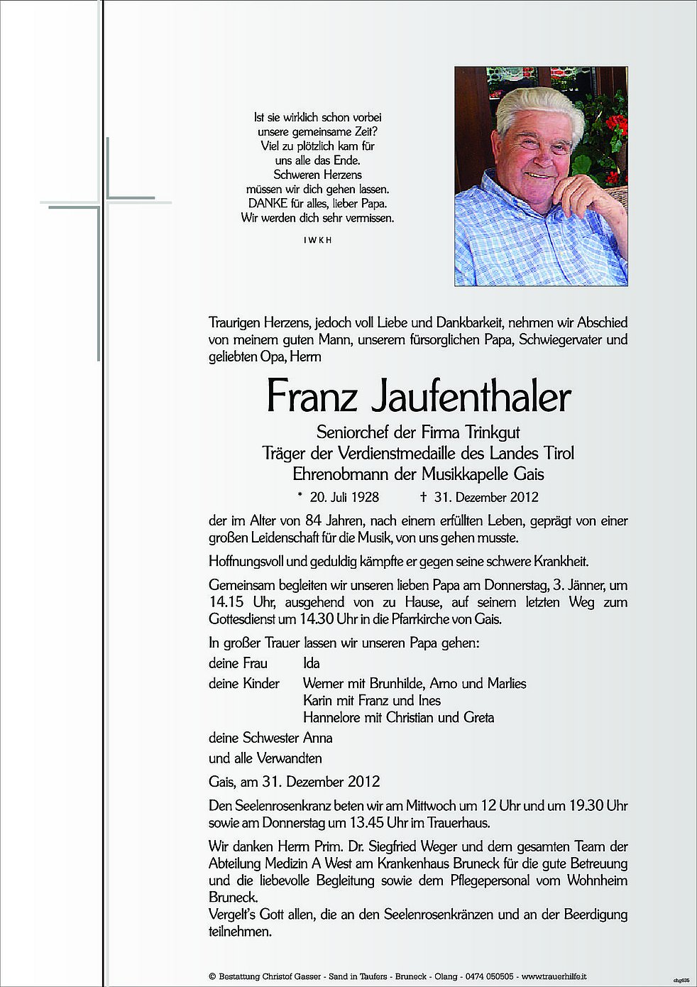 Gemeinsam begleiten wir unseren lieben Papa am Donnerstag, 3. Jänner, um 14.15 Uhr, ausgehend von zu Hause, auf seinem letzten Weg zum Gottesdienst um 14.30 Uhr in die Pfarrkirche von Gais.
