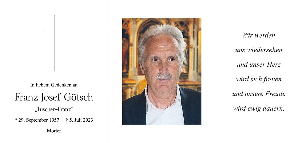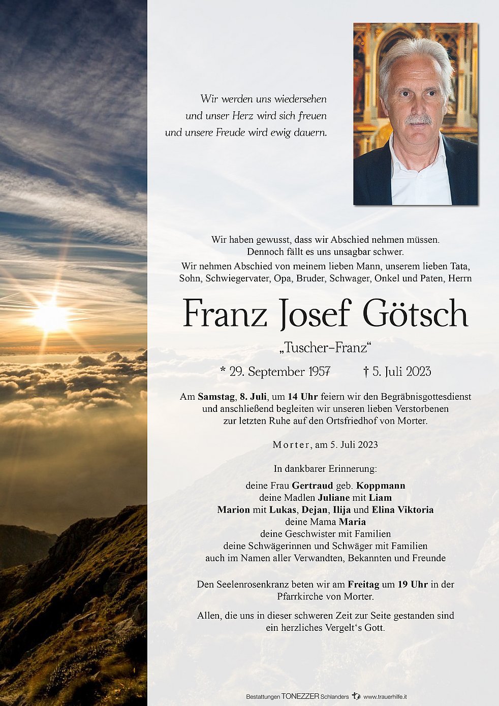 Am Samstag, 8. Juli, um 14 Uhr feiern wir den Begräbnisgottesdienst und anschließend begleiten wir unseren lieben Verstorbenen zur letzten Ruhe auf den Ortsfriedhof von Morter.