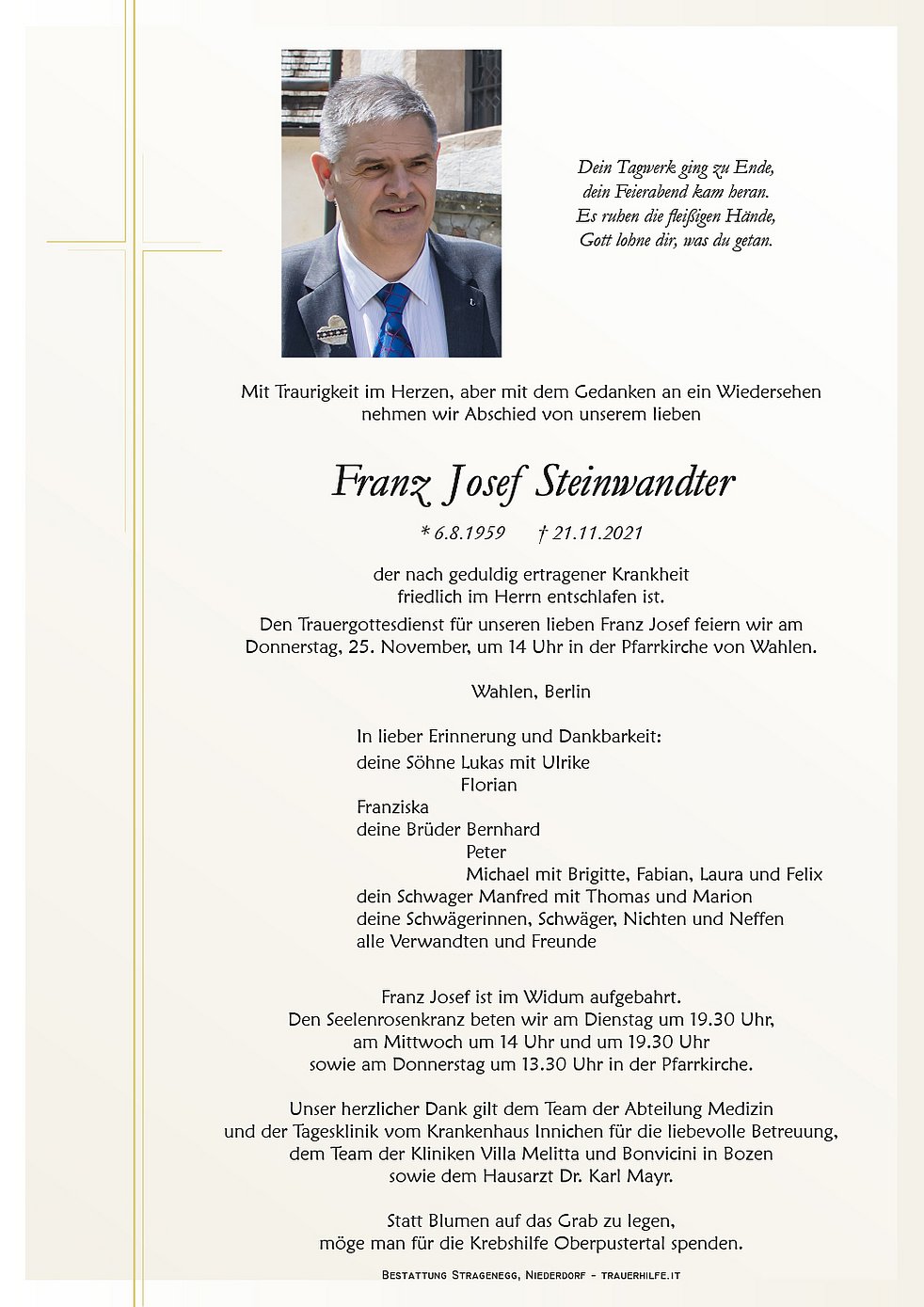 Den Trauergottesdienst für unseren lieben Franz Josef feiern wir am Donnerstag, 25. November, um 14 Uhr in der Pfarrkirche von Wahlen.