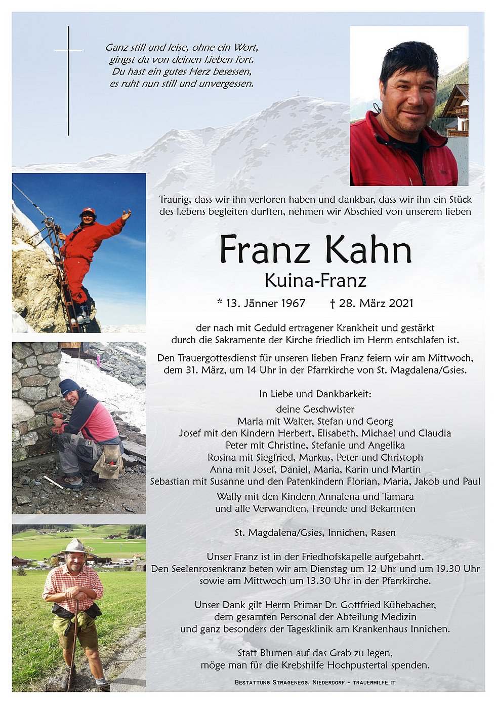 Den Trauergottesdienst für unseren lieben Franz feiern wir am Mittwoch, dem 31. März, um 14 Uhr in der Pfarrkirche von St. Magdalena/Gsies.