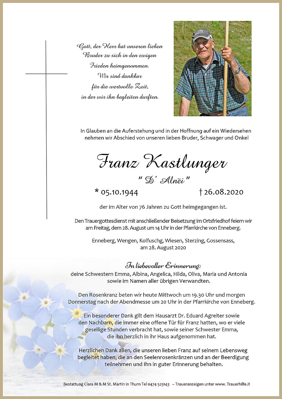 Den Trauergottesdienst mit anschließender Beisetzung im Ortsfriedhof feiern wir am Freitag, dem 28. August um 14 Uhr in der Pfarrkirche von Enneberg.