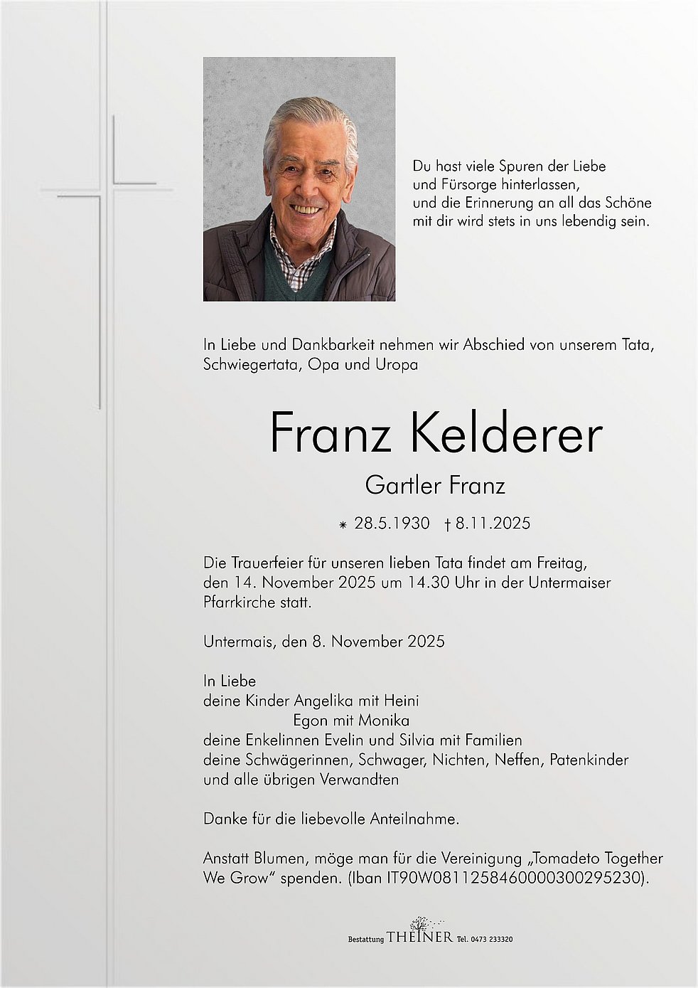 Die Trauerfeier für unseren lieben Tata findet am Freitag, den 14. November 2025 um 14.30 Uhr in der Untermaiser Pfarrkirche statt.
