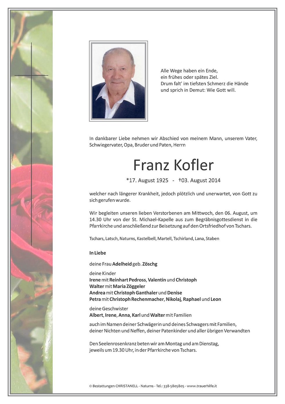 Wir begleiten unseren lieben Verstorbenen am Mittwoch, den 06. August, um 14.30 Uhr von der St. Michael-Kapelle aus zum Begräbnisgottesdienst in die Pfarrkirche und anschließend zur Beisetzung auf den Ortsfriedhof von Tschars.