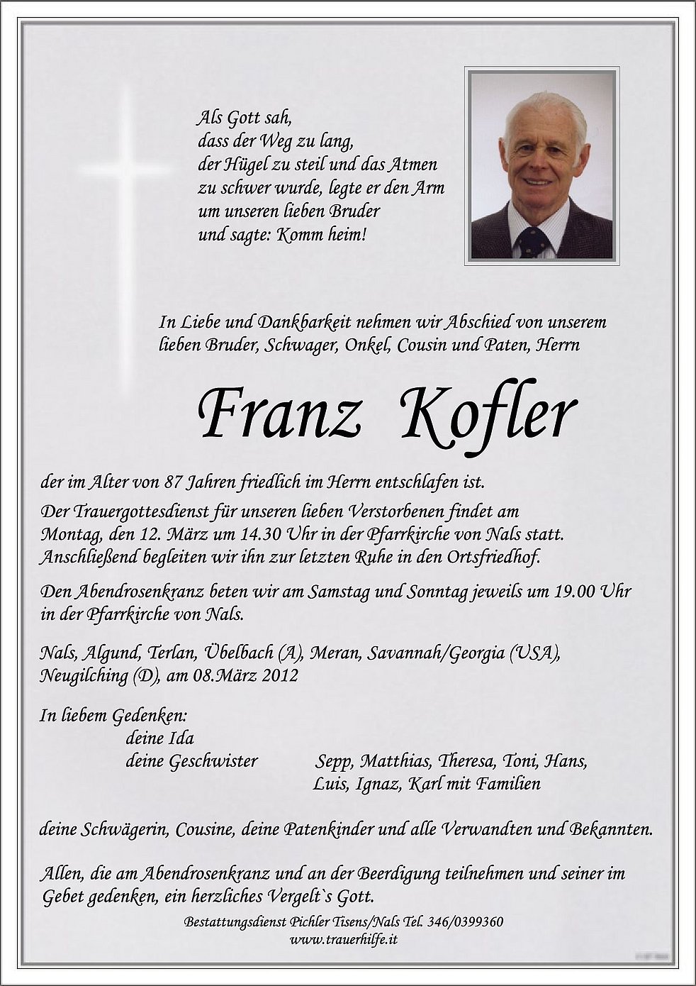 Nals, Algund, Terlan, Übelbach (A), Meran, Savannah/Georgia (USA),