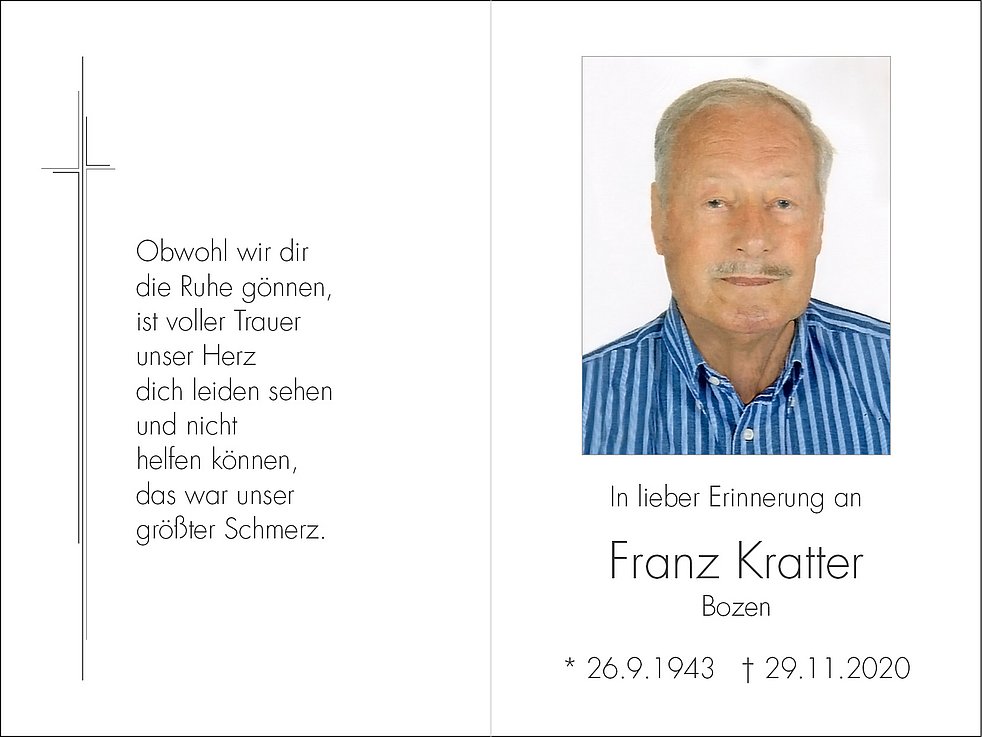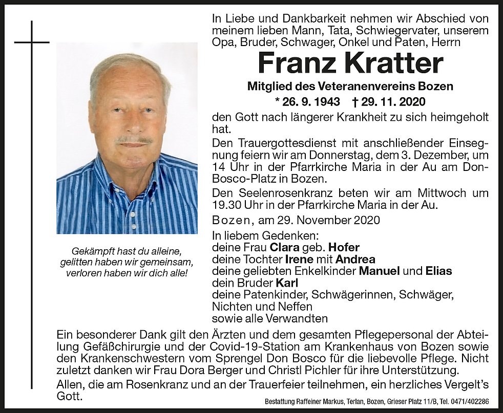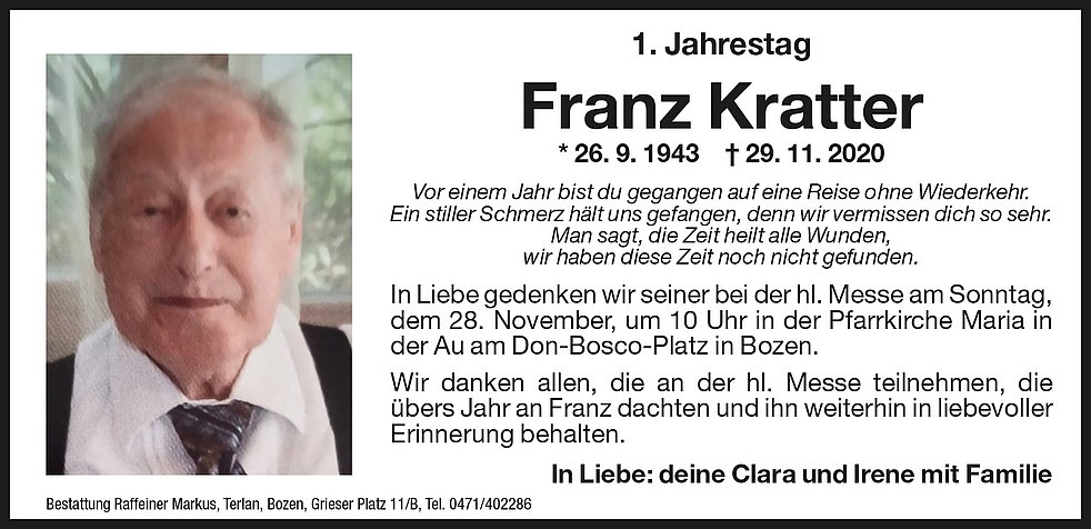Den Trauergottesdienst mit anschließender Einsegnung feiern wir am Donnerstag, dem 3. Dezember, um 14 Uhr in der Pfarrkirche Maria in der Au am Don-Bosco-Platz in Bozen.