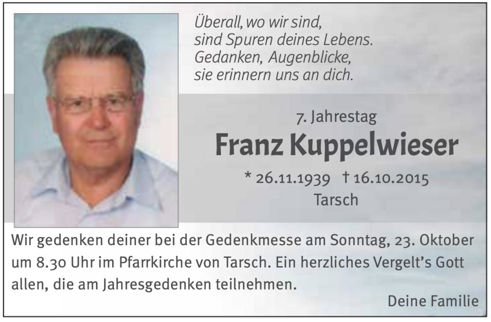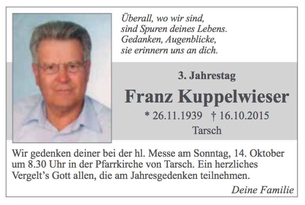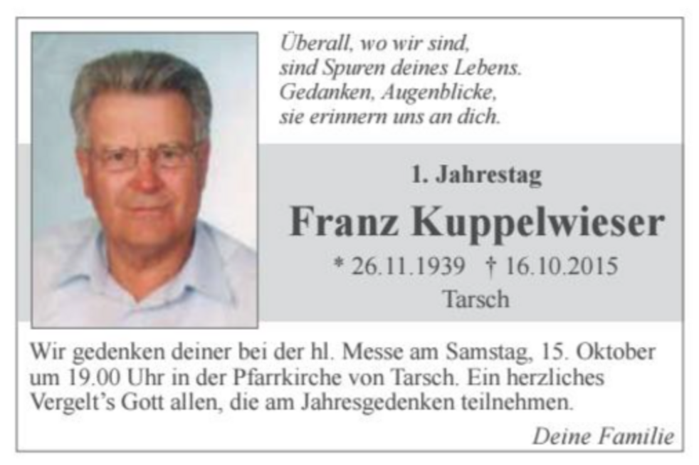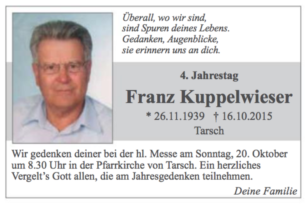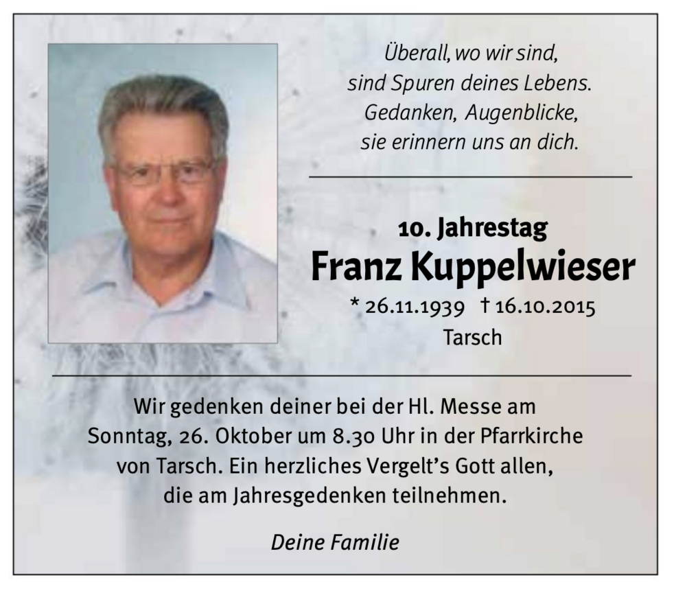 Wir begleiten unseren lieben Franz am Montag, 19. Oktober, um 14.30 Uhr vom Trauerhaus aus zum Abschiedsgottesdienst in die Pfarrkirche von Tarsch.