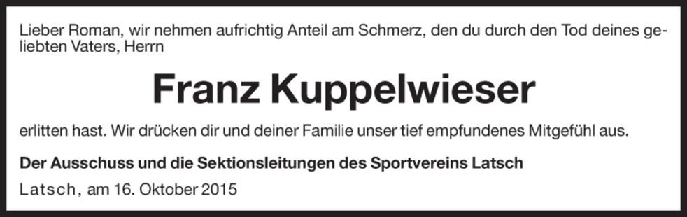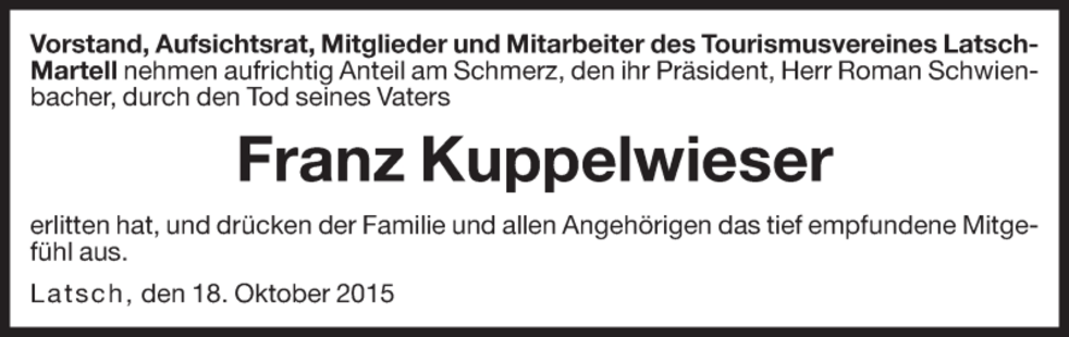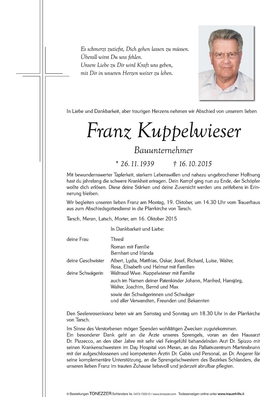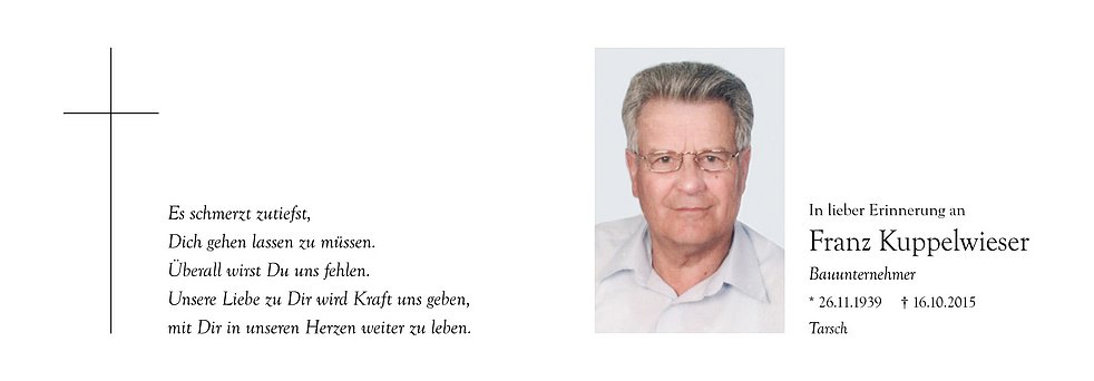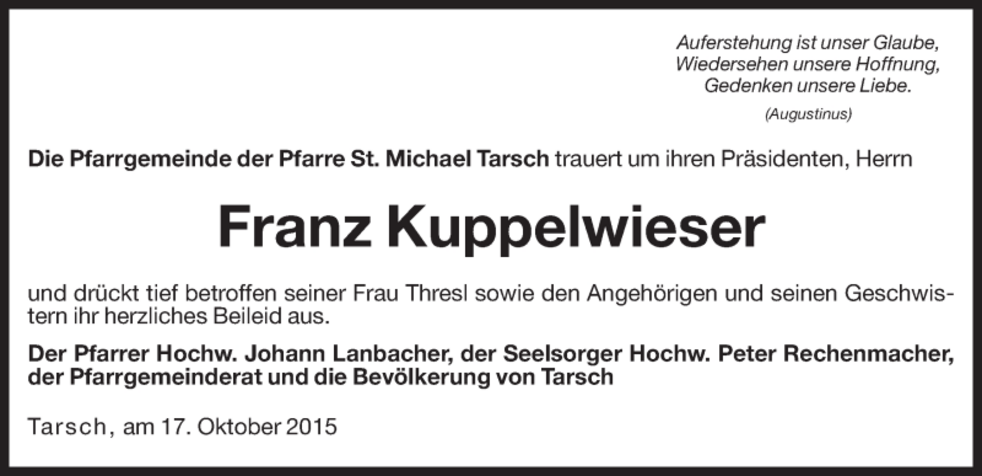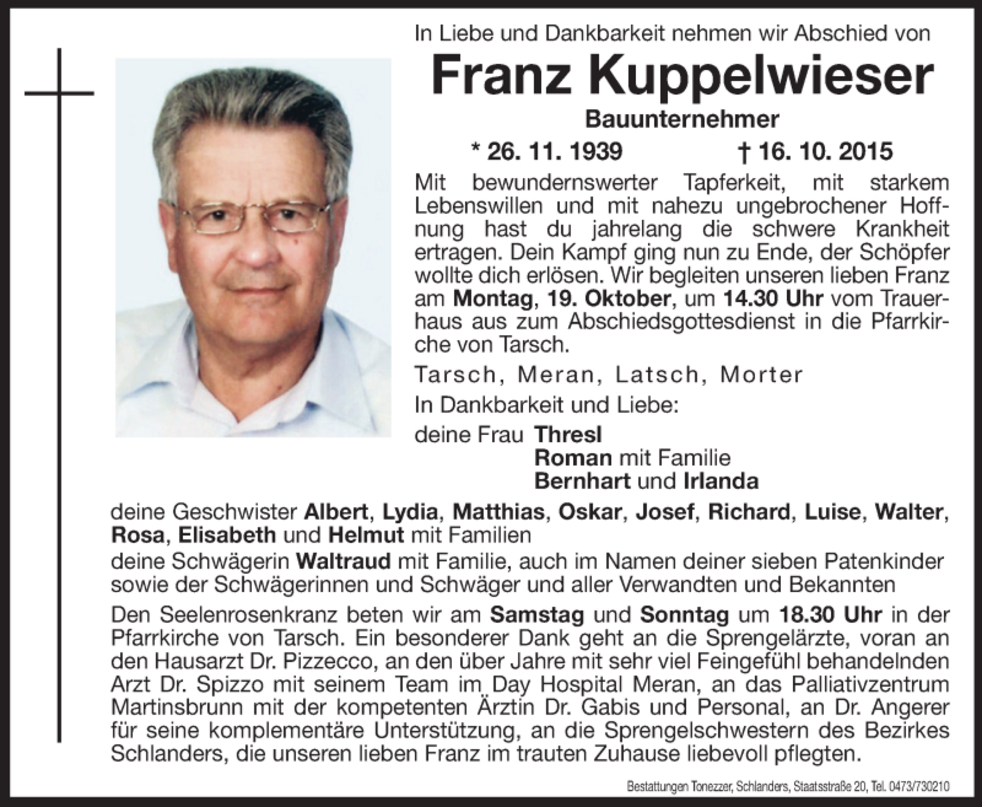 Wir begleiten unseren lieben Franz am Montag, 19. Oktober, um 14.30 Uhr vom Trauerhaus aus zum Abschiedsgottesdienst in die Pfarrkirche von Tarsch.