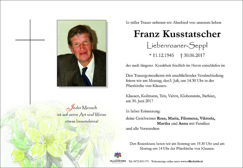 Den Trauergottesdienst mit anschließender Verabschiedung feiern wir am Montag, den3. Juli, um 14.30 Uhr in der Pfarrkirche von Klausen.