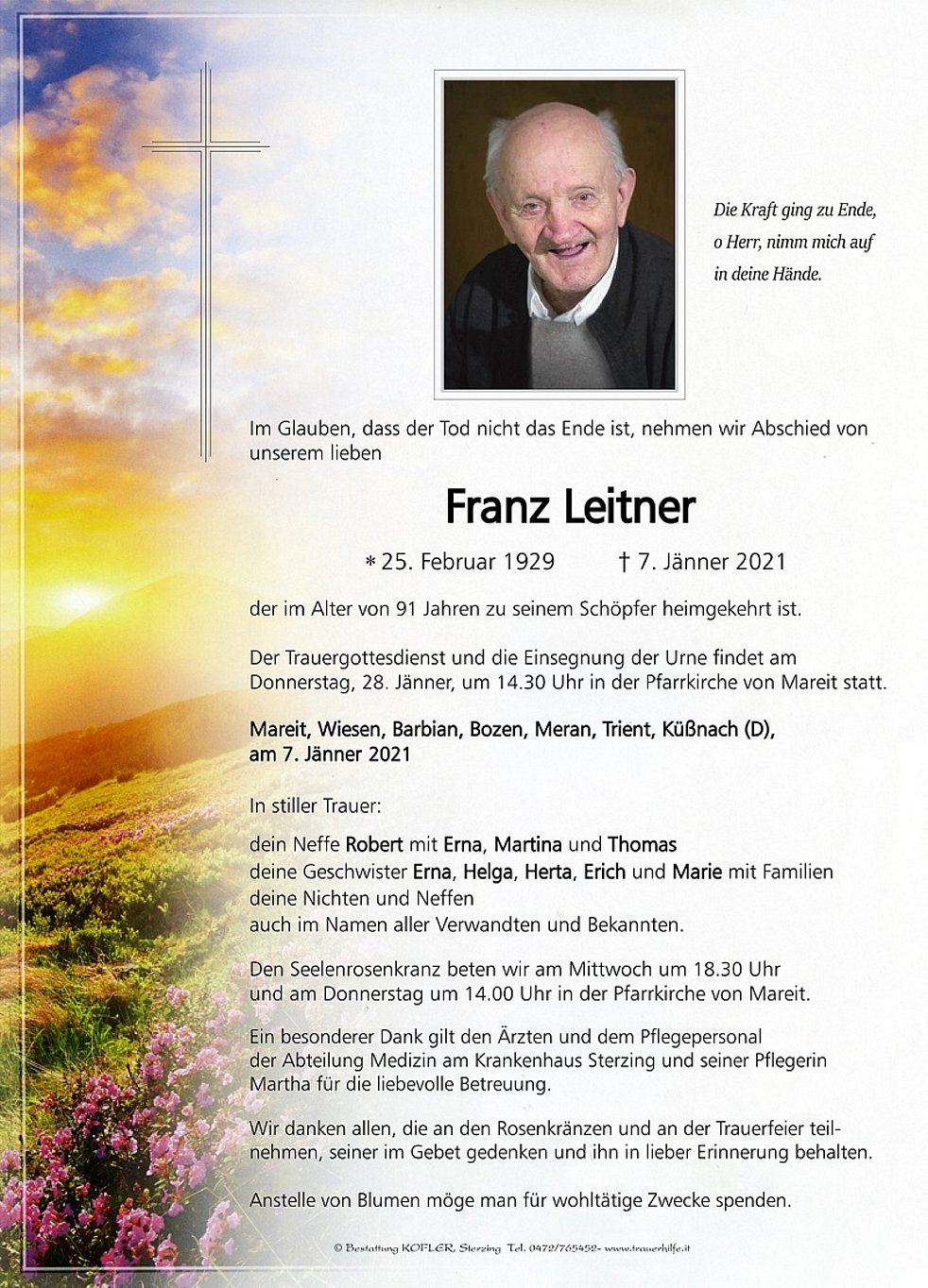 Der Trauergottesdienst und die Einsegnung der Urne findet am Donnerstag, 28. Jänner, um 14.30 Uhr in der Pfarrkirche von Mareit statt.