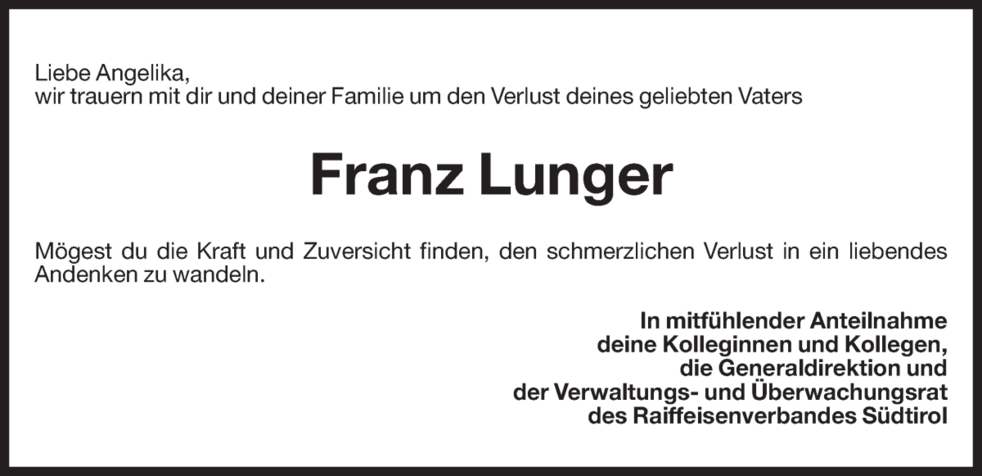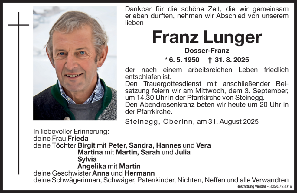 Den Trauergottesdienst mit anschließender Beisetzung feiern wir am Mittwoch, den 3. September, um 14.30 Uhr in der Pfarrkirche von Steinegg .
