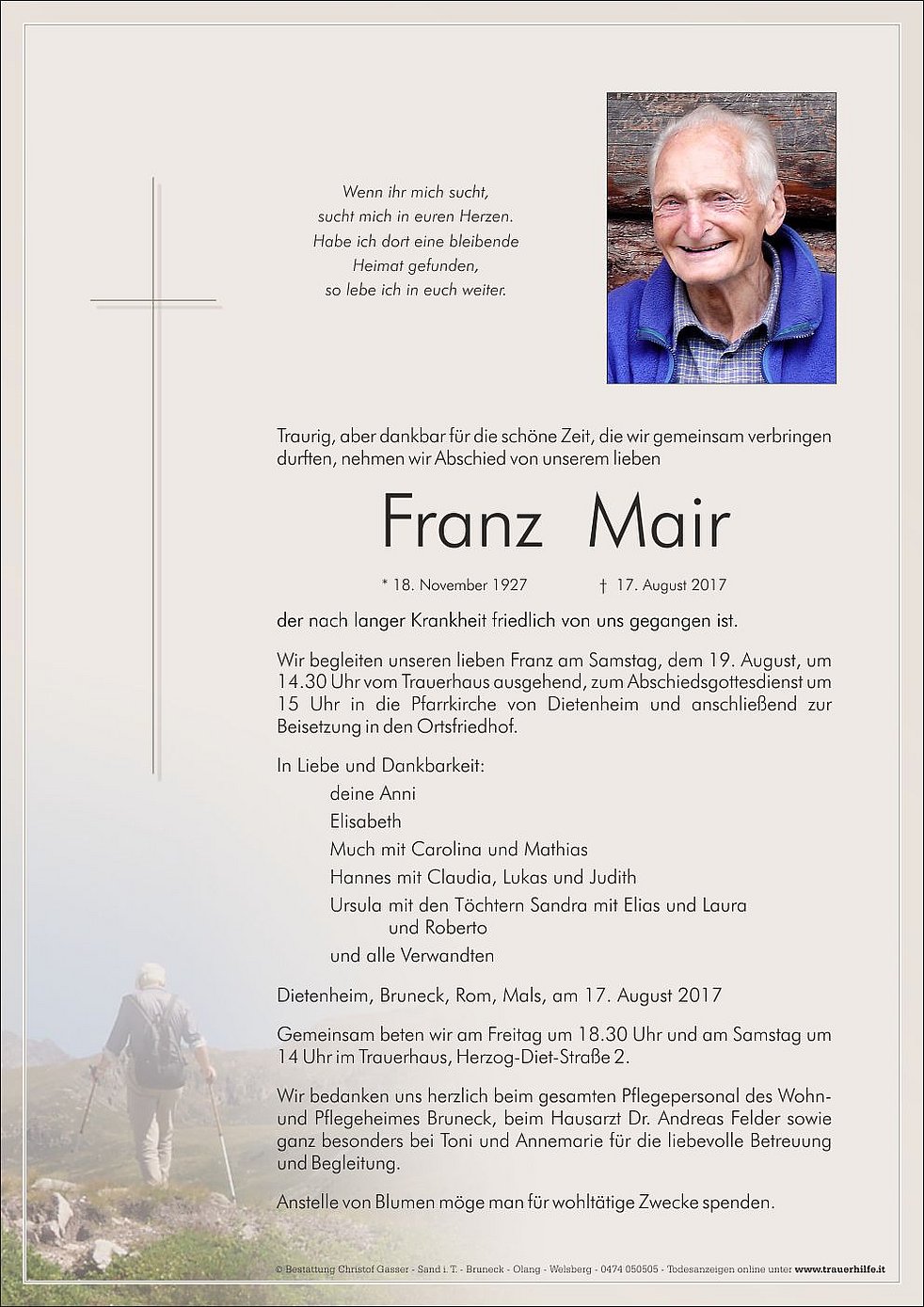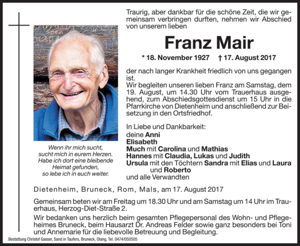 Wir bedanken uns herzlich beim gesamten Pflegepersonal des Wohn- und Pflegeheimes Bruneck, beim Hausarzt Dr. Andreas Felder sowie ganz besonders bei Toni und Annemarie für die liebevolle Betreuung und Begleitung.