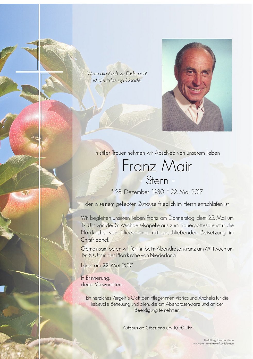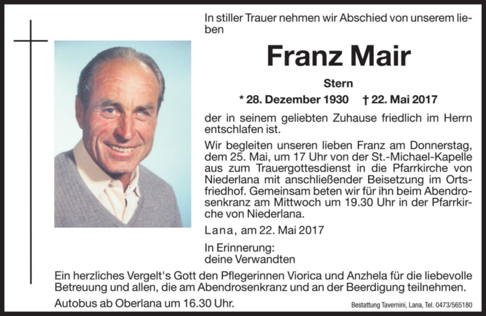 Wir begleiten unseren lieben Franz am Donnerstag, dem 25. Mai um 17 Uhr von der St. Michaels-Kapelle aus zum Trauergottesdienst in die Pfarrkirche von Niederlana, mit anschließender Beisetzung im Ortsfriedhof.
