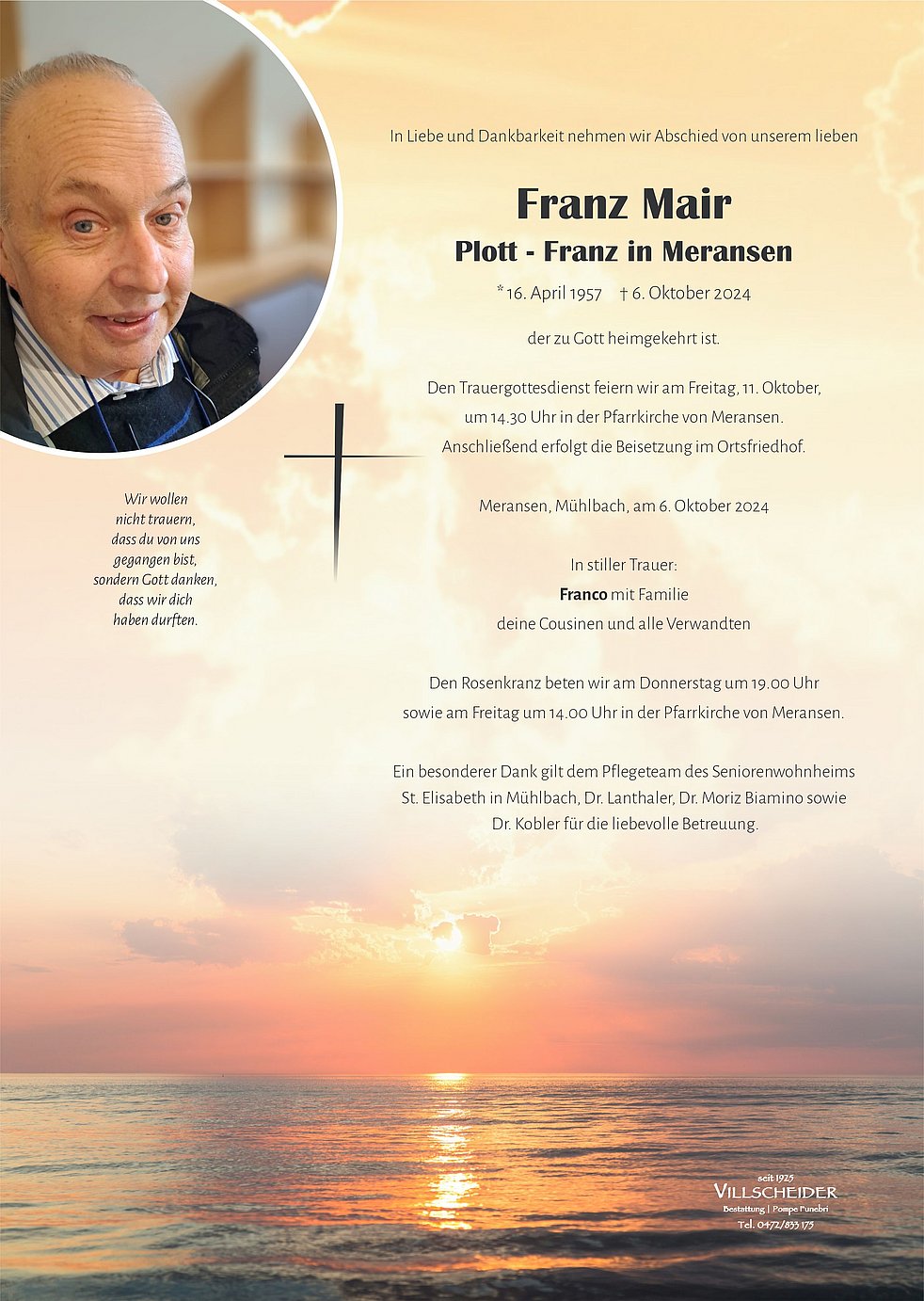 Lieber Franz, die Nachricht von deinem Ableben hat mich sehr getroffen. Du warst mir stets ein guter Freund, auf den ich mich verlassen konnte. Ich wünsche dir eine gute Reise, du wirst mir fehlen!