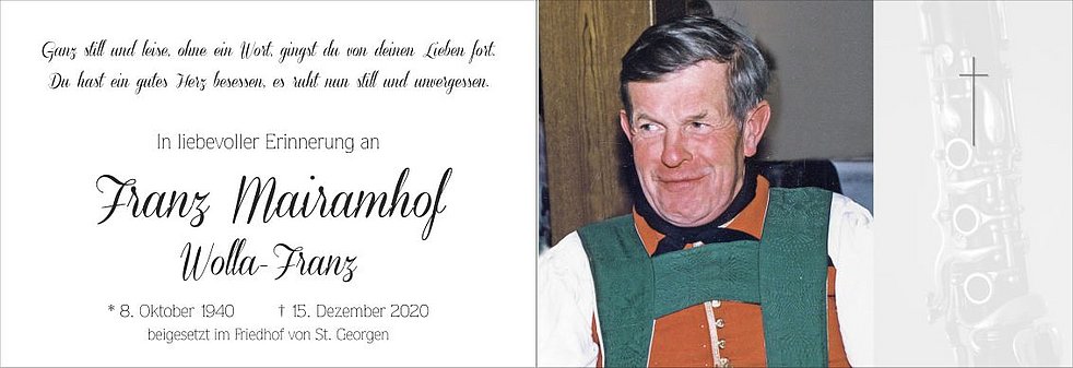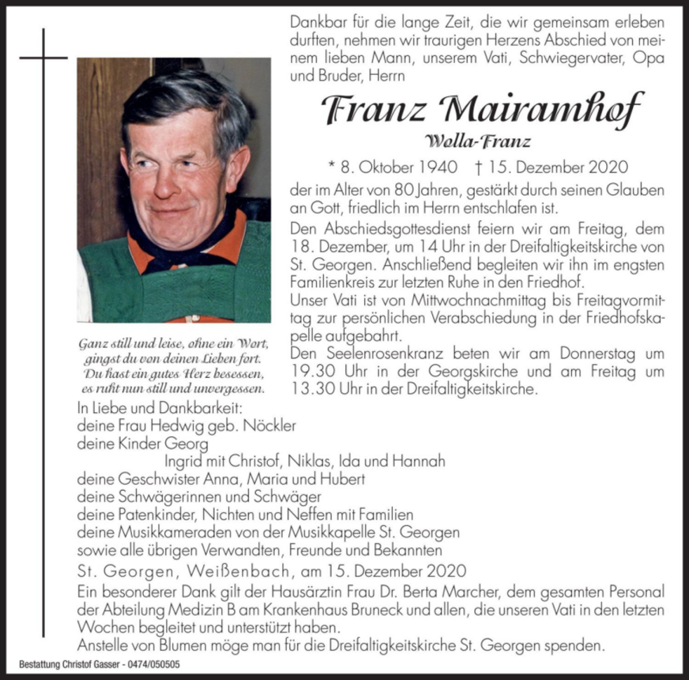Den Abschiedsgottesdienst feiern wir am Freitag, dem 18. Dezember, um 14 Uhr in der Dreifaltigkeitskirche von St. Georgen. Anschließend begleiten wir ihn im engsten Familienkreis zur letzten Ruhe in den Friedhof.