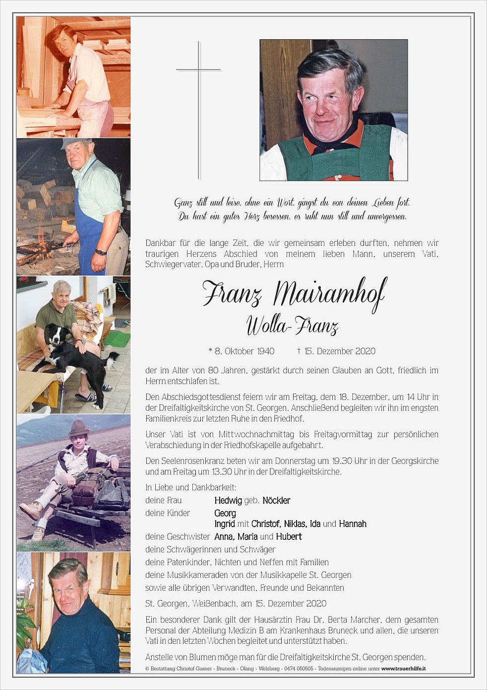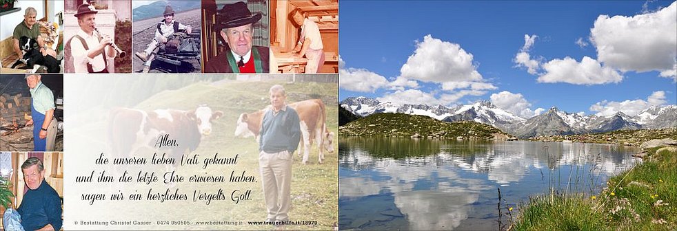 Ein besonderer Dank gilt der Hausärztin Frau Dr. Berta Marcher, dem gesamten Personal der Abteilung Medizin B am Krankenhaus Bruneck und allen, die unseren Vati in den letzten Wochen begleitet und unterstützt haben.