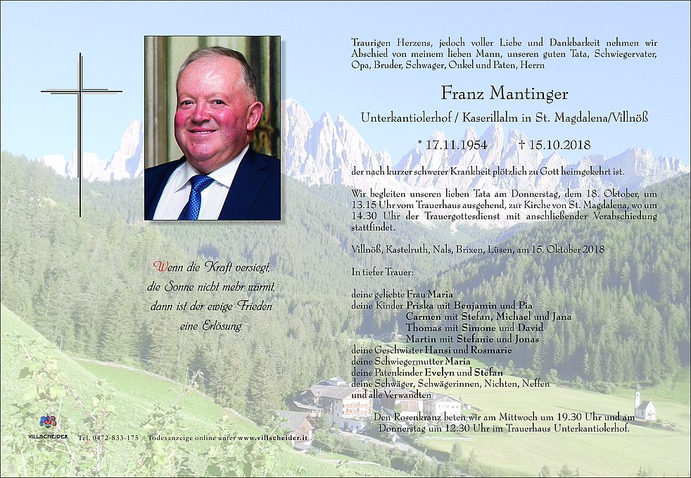 Wir begleiten unseren lieben Tata am Donnerstag, dem 18. Oktober, um 13.15 Uhr vom Trauerhaus ausgehend, zur Kirche von St. Magdalena, wo um 14.30 Uhr der Trauergottesdienst mit anschließender Verabschiedung stattfindet.