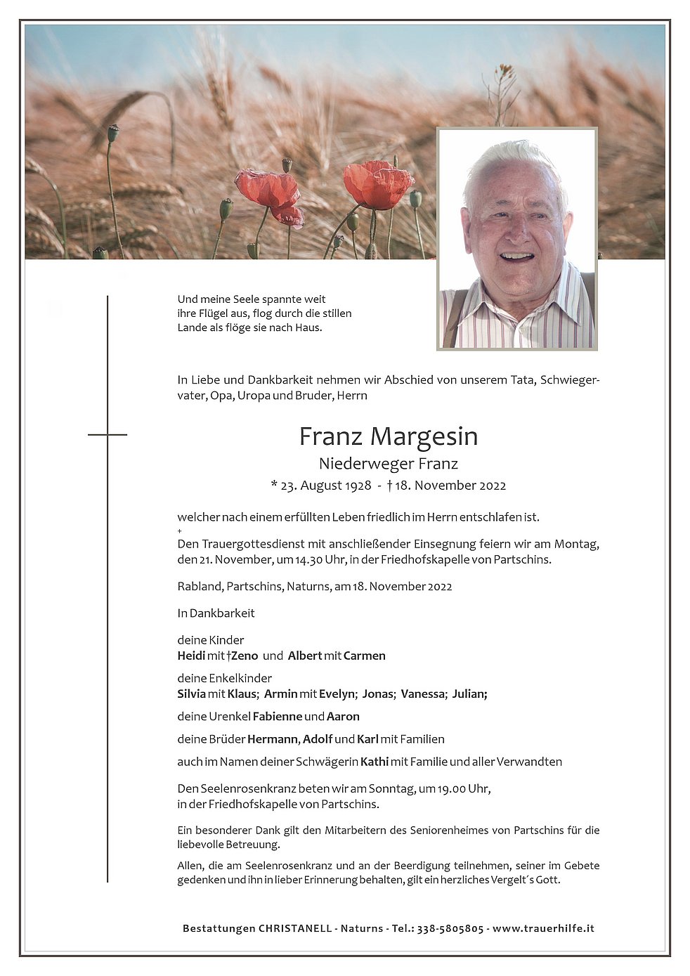 Den Trauergottesdienst mit anschließender Einsegnung feiern wir am Montag, den 21. November, um 14.30 Uhr, in der Friedhofskapelle von Partschins.