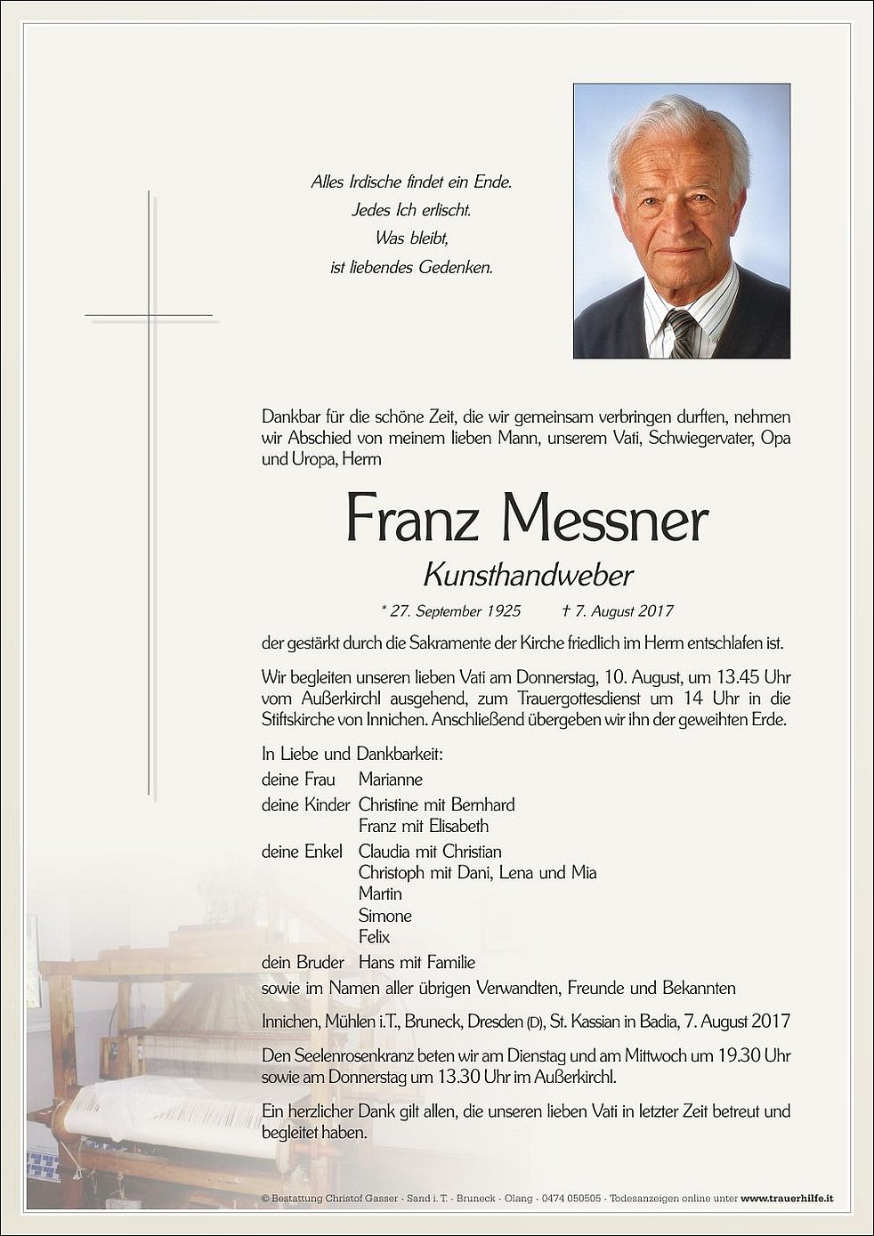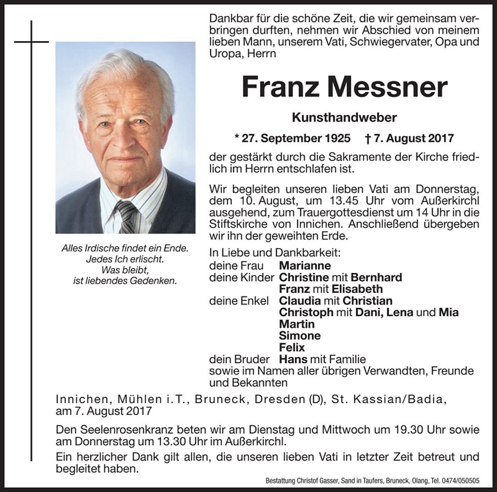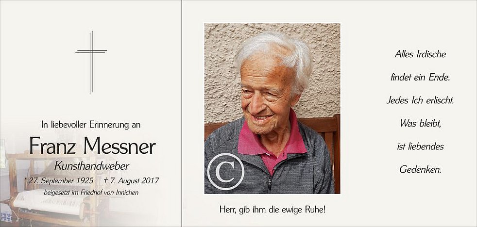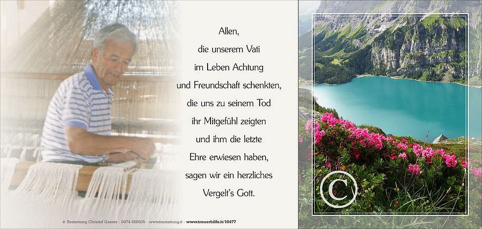 Wir begleiten unseren lieben Vati am Donnerstag, 10. August, um 13.45 Uhr vom Außerkirchl ausgehend, zum Trauergottesdienst um 14 Uhr in die Stiftskirche von Innichen. Anschließend übergeben wir ihn der geweihten Erde.