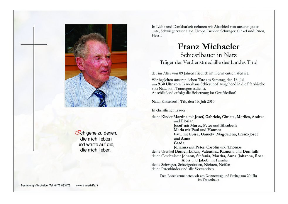 um 9.30 Uhr vom Trauerhaus Schiestlhof ausgehend in die Pfarrkirche von Natz zum Trauergottesdienst.