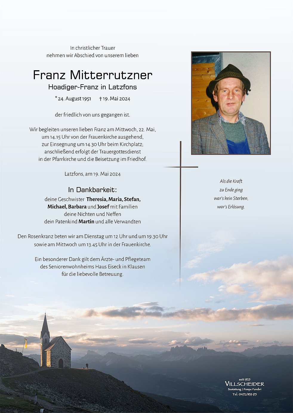 Begräbnisgottesdienst: 22.05. - 14:30 Uhr Latzfons