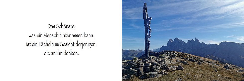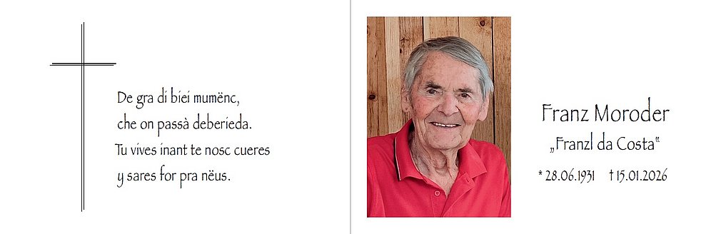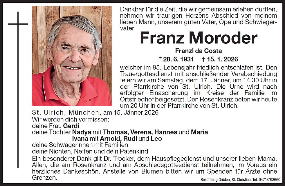 Den Trauergottesdienst mit anschließender Verabschiedung feiern wir am Samstag, dem 17. Jänner, um 14.30 Uhr in der Pfarrkirche von St. Ulrich. Die Urne wird nach erfolgter Einäscherung im Kreise der Familie im Ortsfriedhof beigesetzt.