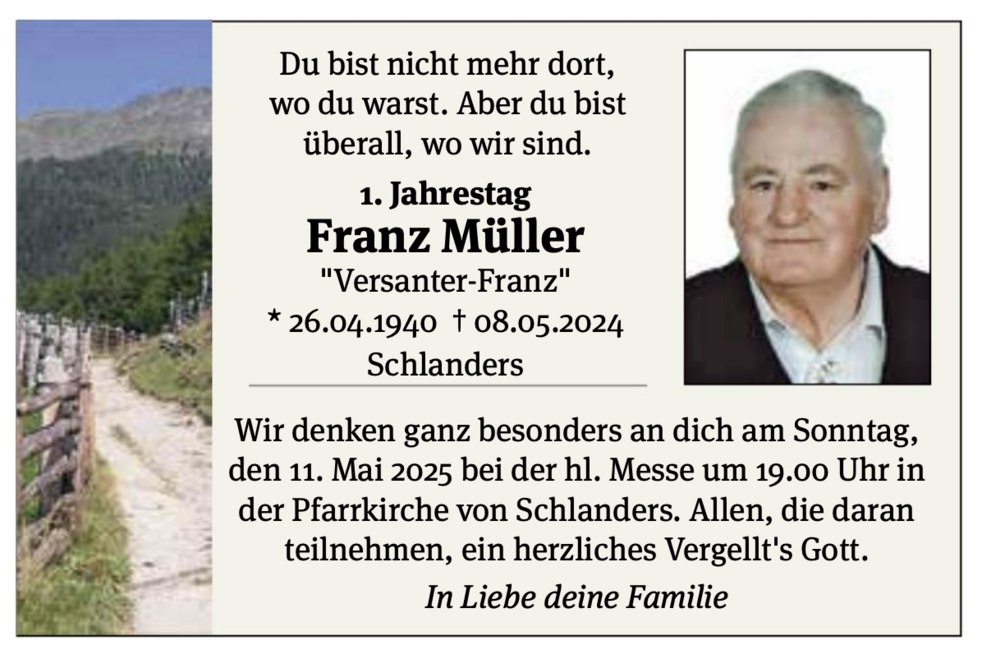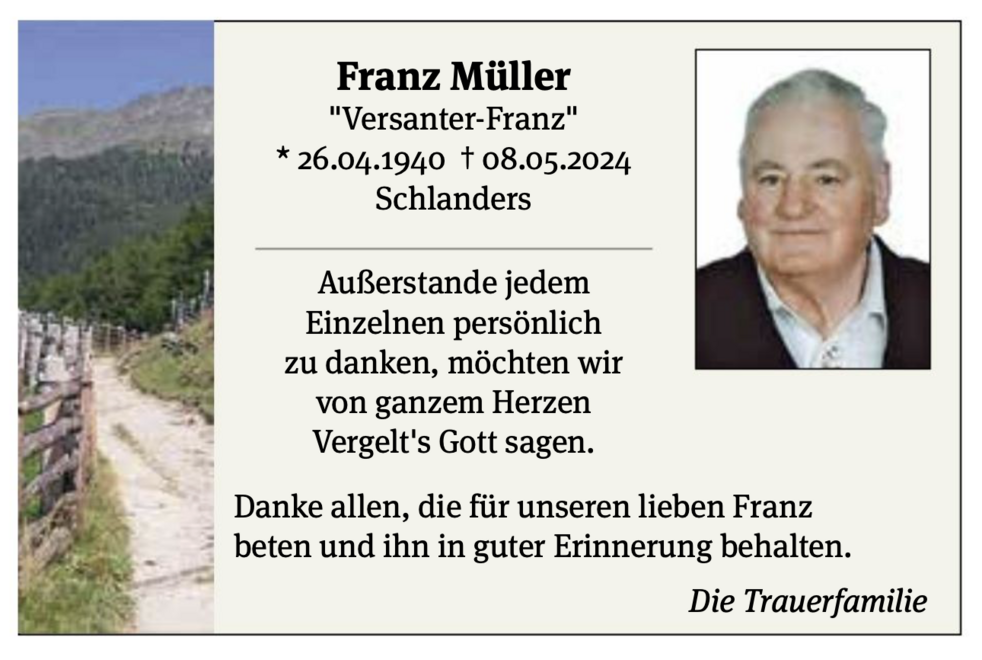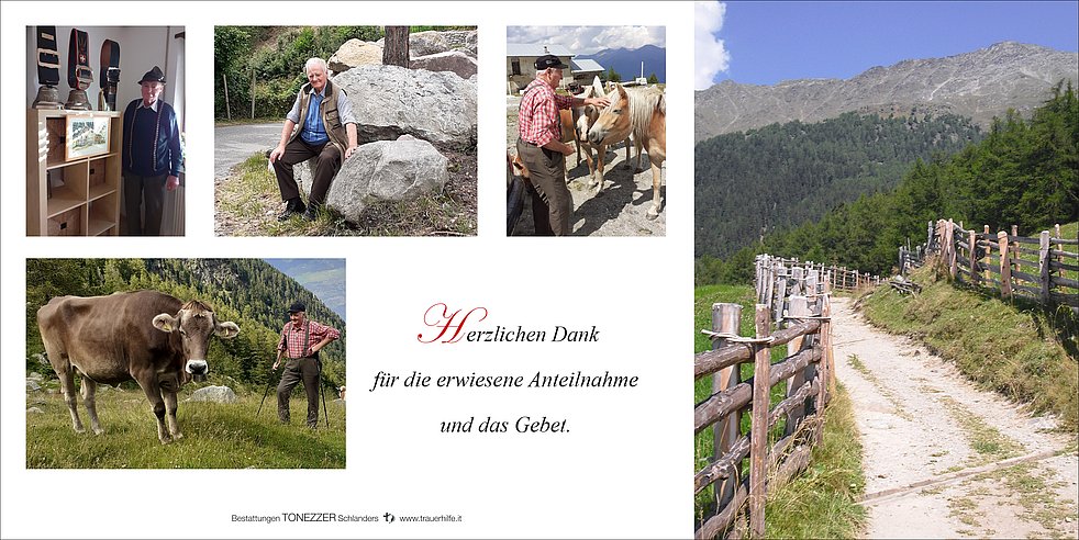 Ein besonderer Dank gilt dem gesamten Personal vom Bürgerheim St. Nikolaus v.d.Flüe in Schlanders für die liebevolle und fürsorgliche Betreuung.