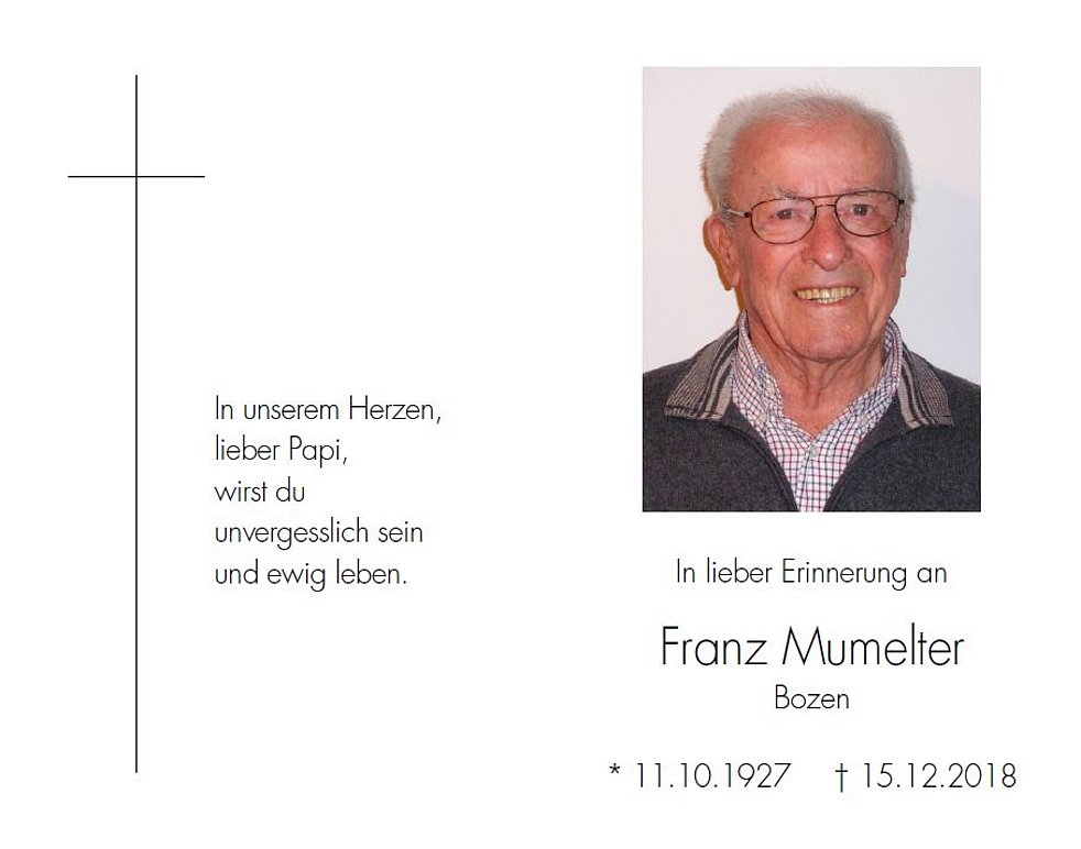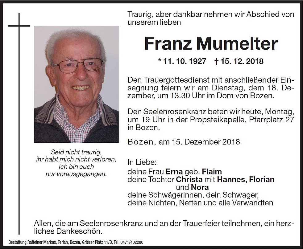Den Trauergottesdienst mit anschlieβender Einsegnung feiern wir am Dienstag, dem 18. Dezember, um 13.30 Uhr im Dom von Bozen.