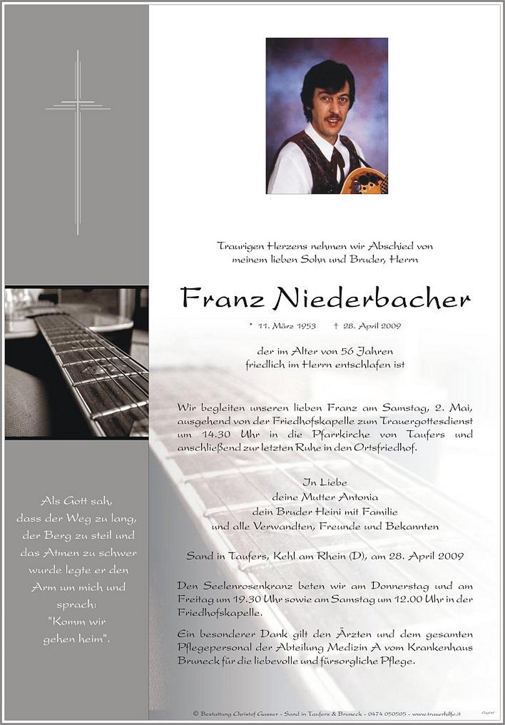 Wir begleiten unseren lieben Franz am Samstag, 2. Mai, ausgehend von der Friedhofskapelle zum Trauergottesdienst um 14.30 Uhr in die Pfarrkirche von Taufers und anschließend zur letzten Ruhe in den Ortsfriedhof.