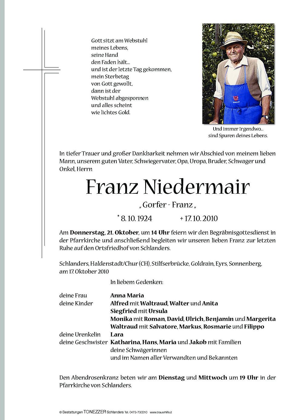 Am Donnerstag, 21. Oktober, um 14 Uhr feiern wir den Begräbnisgottesdienst in der Pfarrkirche und anschließend begleiten wir unseren lieben Franz zur letzten Ruhe auf den Ortsfriedhof von Schlanders.