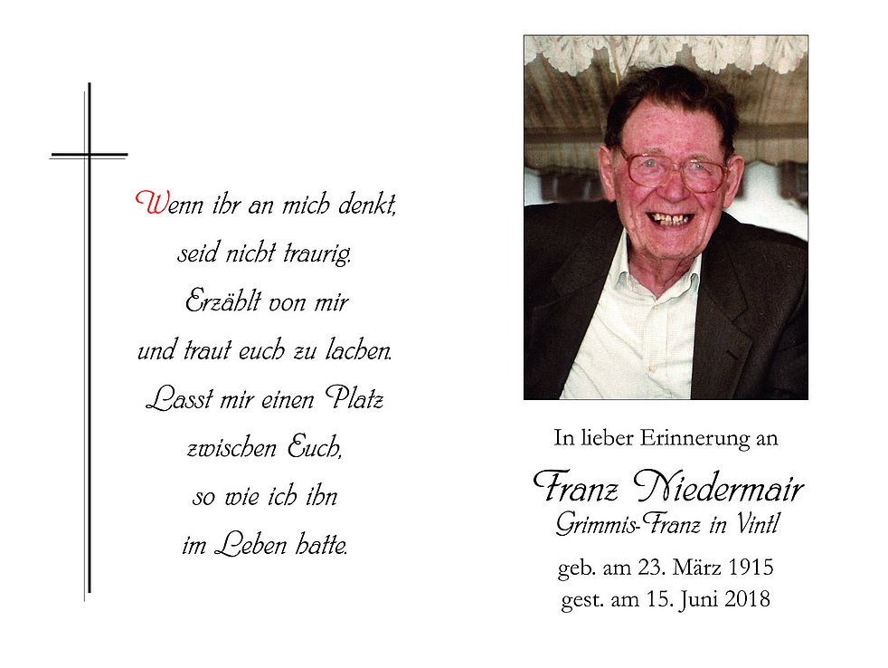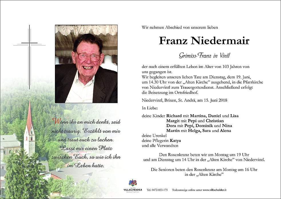 um 14.30 Uhr von der „Alten Kirche” ausgehend, in die Pfarrkirche von Niedervintl zum Trauergottesdienst. Anschließend erfolgt