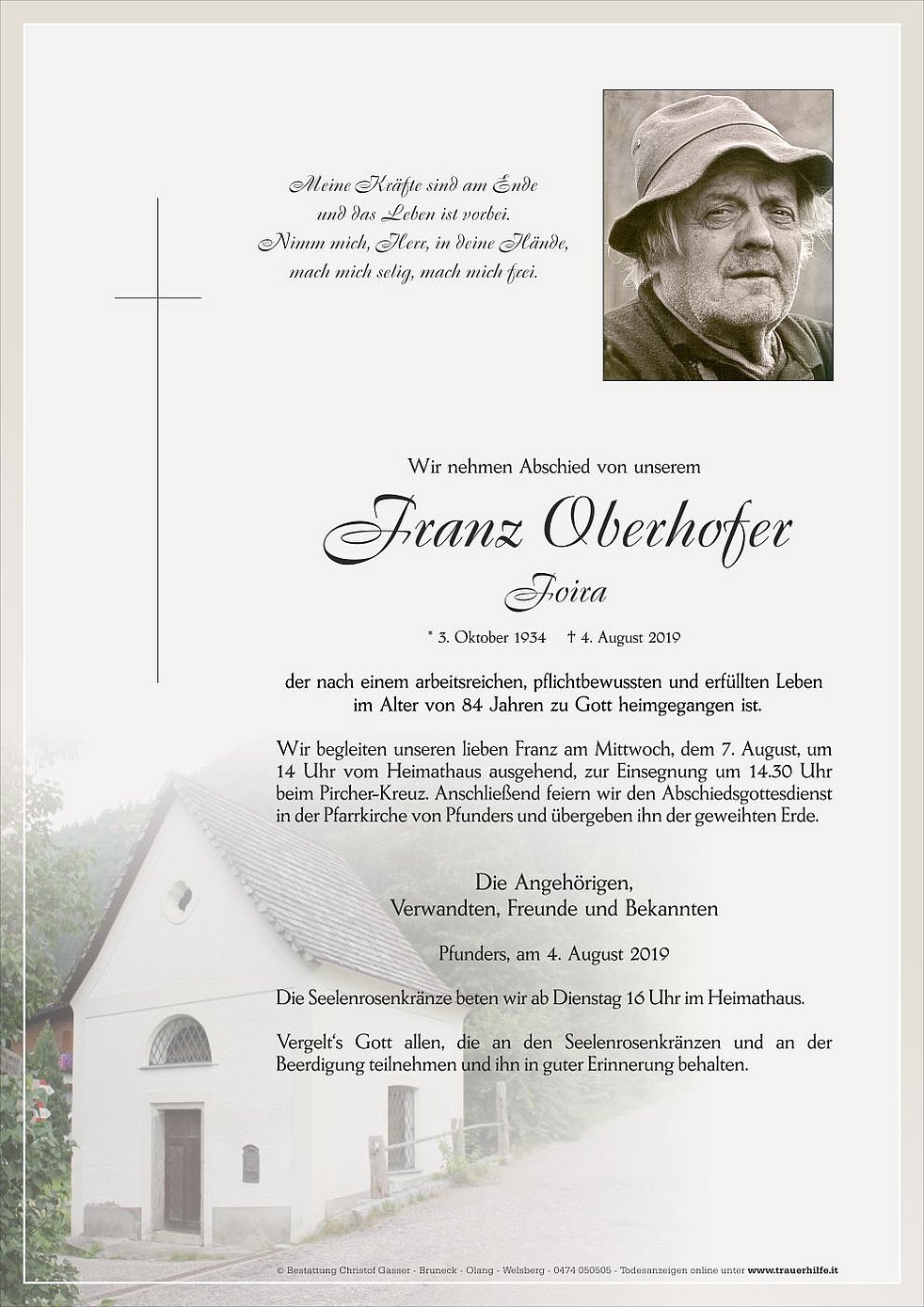 14 Uhr vom Heimathaus ausgehend, zur Einsegnung um 14.30 Uhr beim Pircher-Kreuz. Anschließend feiern wir den Abschiedsgottesdienst in der Pfarrkirche von Pfunders und übergeben ihn der geweihten Erde.