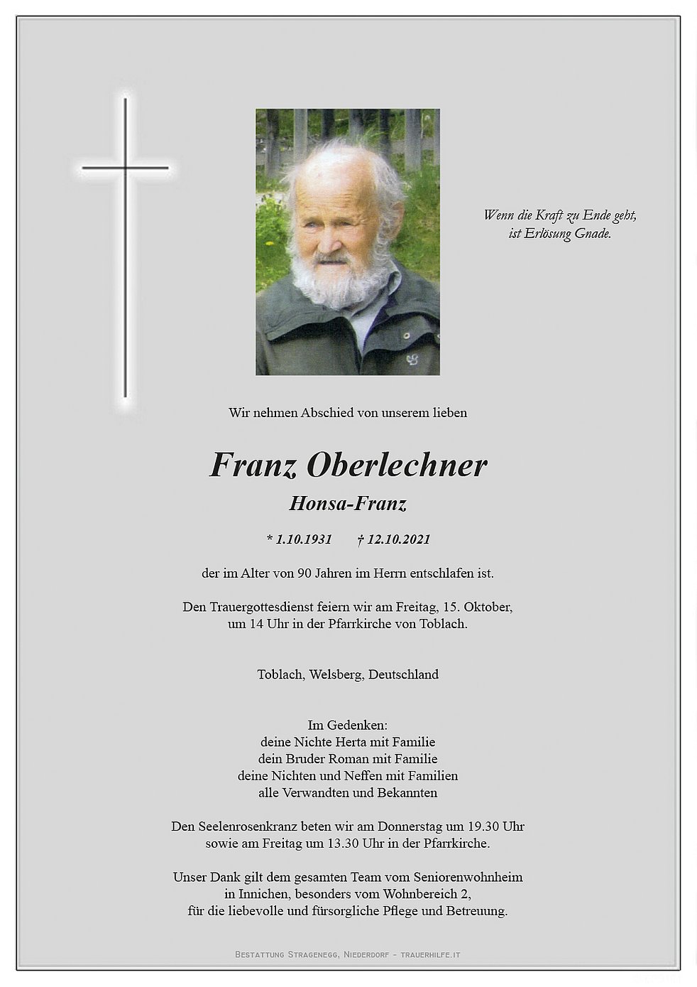 Den Trauergottesdienst feiern wir am Freitag, 15. Oktober, um 14 Uhr in der Pfarrkirche von Toblach.