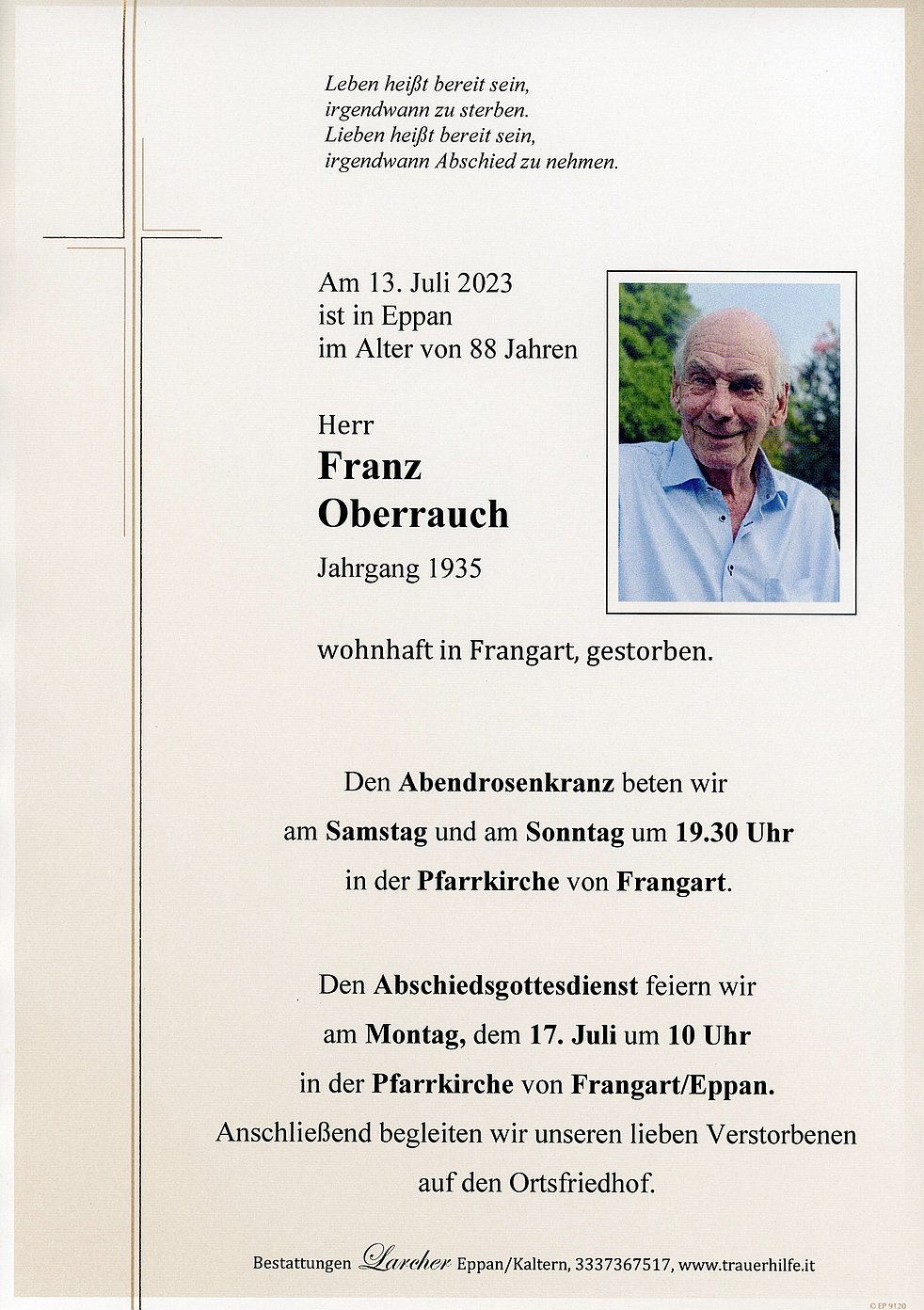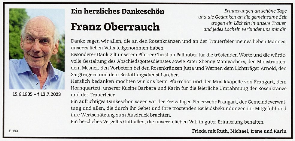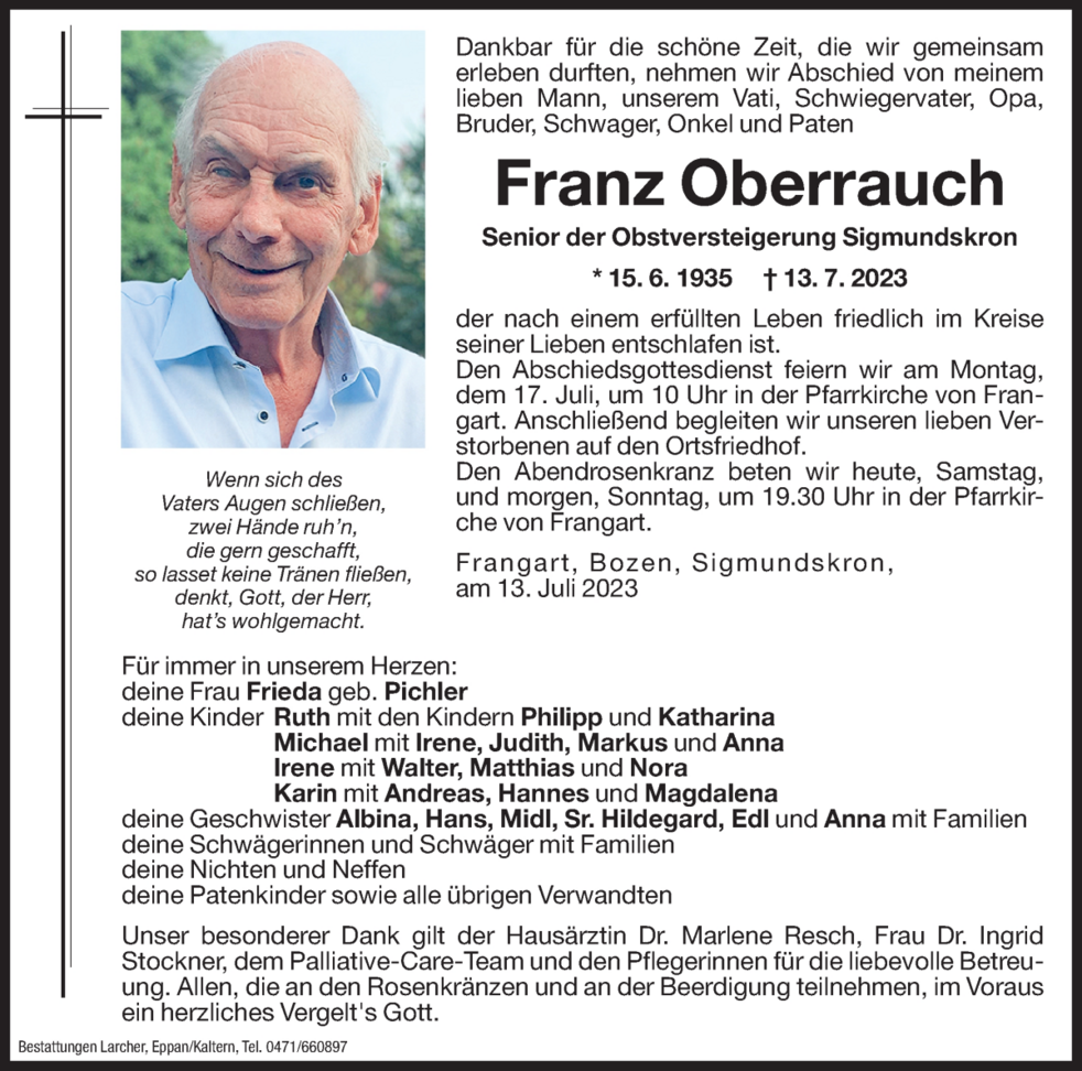 Den Abschiedsgottesdienst feiern wir am Montag, dem 17. Juli um 10 Uhr in der Pfarrkirche von Frangart. Anschließend begleiten wir unseren lieben Verstorbenen auf den Ortsfriedhof.