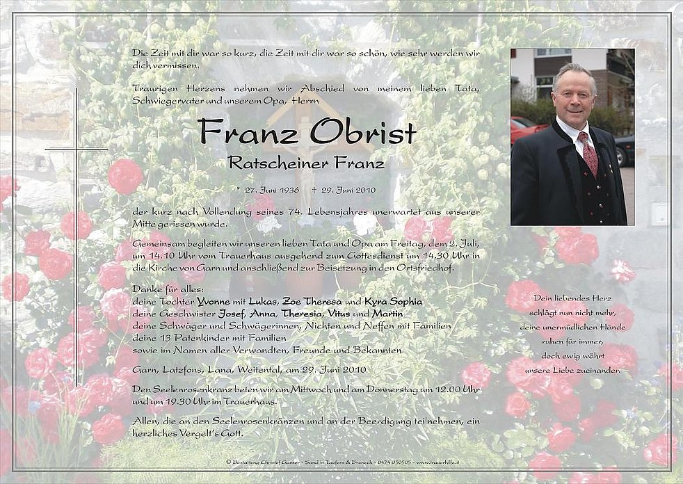Gemeinsam begleiten wir unseren lieben Tata und Opa am Freitag, dem 2. Juli, um 14.10 Uhr vom Trauerhaus ausgehend zum Gottesdienst um 14.30 Uhr in die Kirche von Garn und anschließend zur Beisetzung in den Ortsfriedhof.