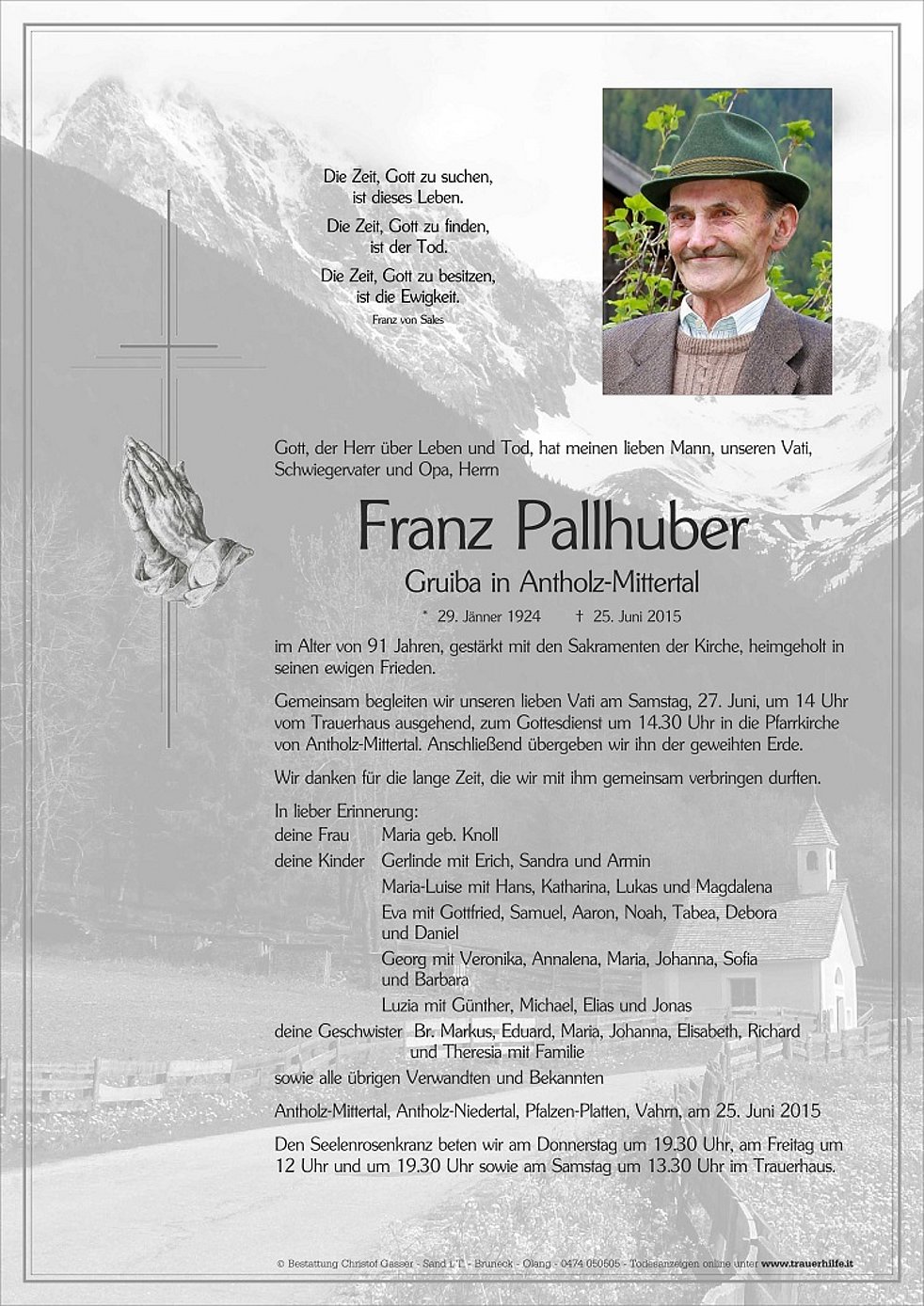 Gemeinsam begleiten wir unseren lieben Vati am Samstag, 27. Juni, um 14 Uhr vom Trauerhaus ausgehend, zum Gottesdienst um 14.30 Uhr in die Pfarrkirche von Antholz-Mittertal. Anschließend übergeben wir ihn der geweihten Erde.